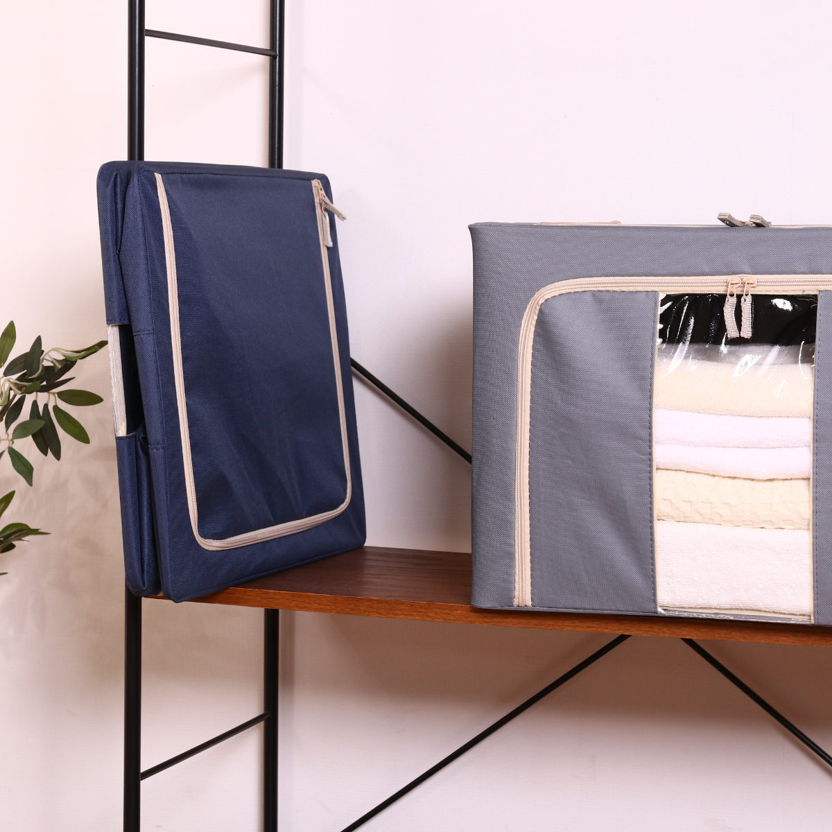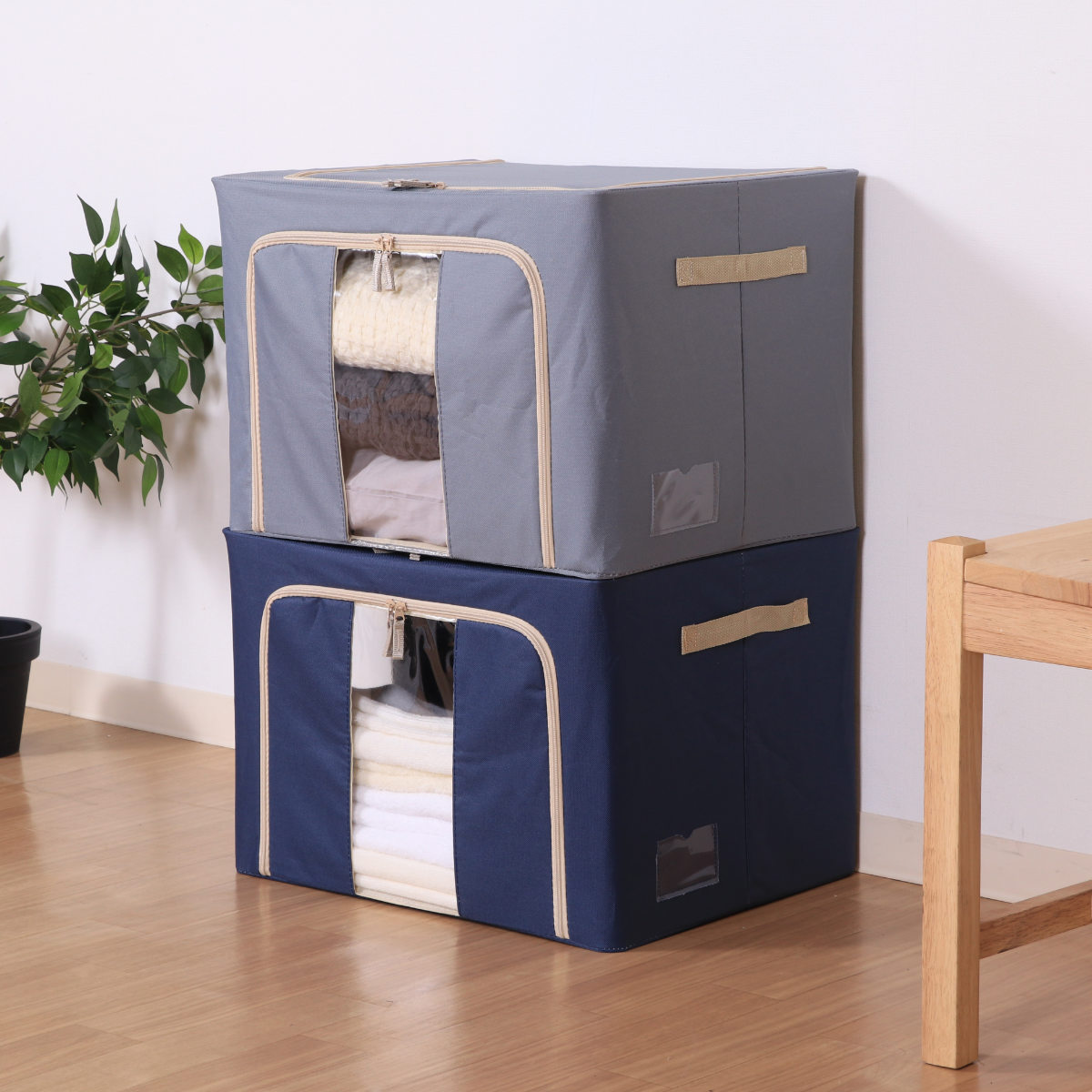 スチール製フレーム入りなので、型崩れしにくく収納物をしっかり支えます。安定感があり積み重ねても安心です。積み重ねることで、限られた場所でも縦のスペースを有効活用できます。