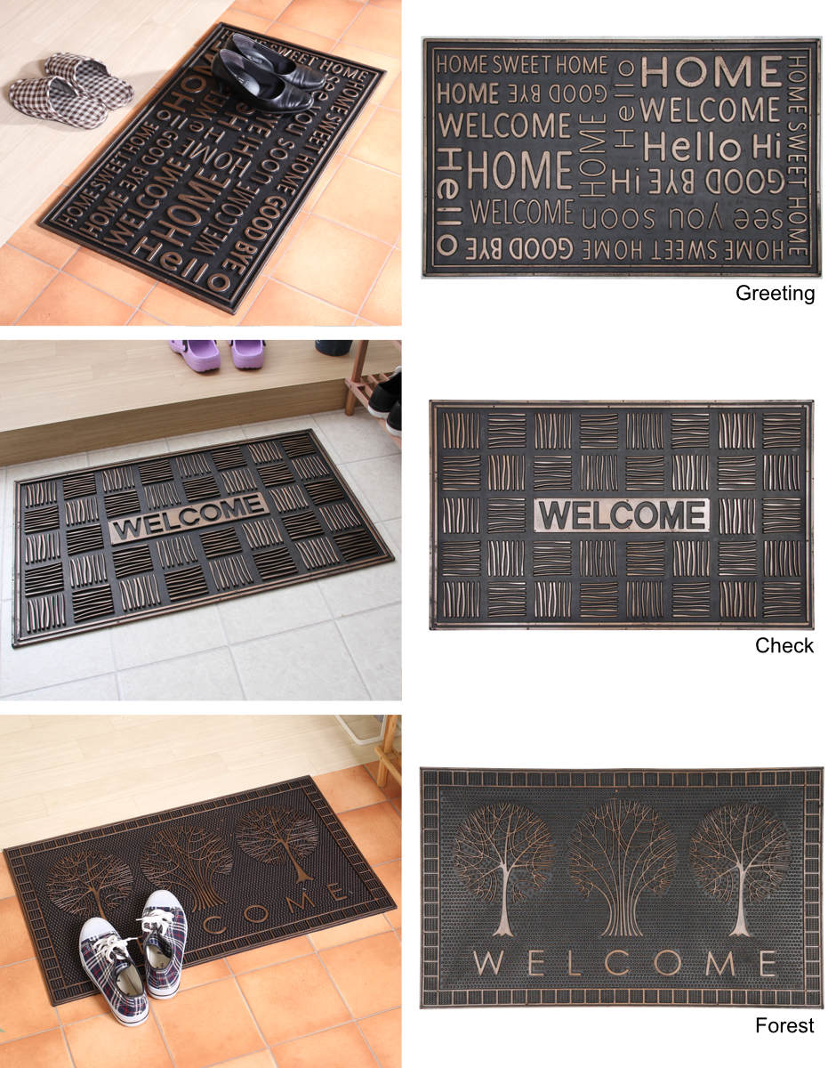 ラバーマットは、家や挨拶に関係する言葉のモノグラム柄「グリーディング」、揺らぎのあるラインを規則的に並べてデザインされた「チェック」、木とWELCOMEの文字で構成された落ちつた雰囲気の「フォレスト」の3つのデザインからお家のテイストやお好みに合わせてお選びいただけます。