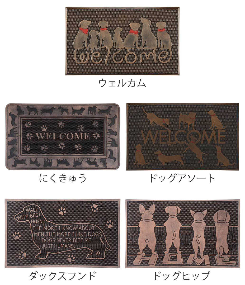ラバーマットは、犬のしっぽでwelcomeの文字が作られた「ウェルカム」、犬のシルエットが周りにデザインされたマット自体の角が丸い「にくきゅう」、様々な犬種のシルエットが描かれた「ドッグアソート」、ダックスフンドの中に文字がデザインされた「ダックスフンド」、犬の後ろ姿かわいらしい「ドッグヒップ」の5つのデザインからお家のテイストやお好みに合わせてお選びいただけます。