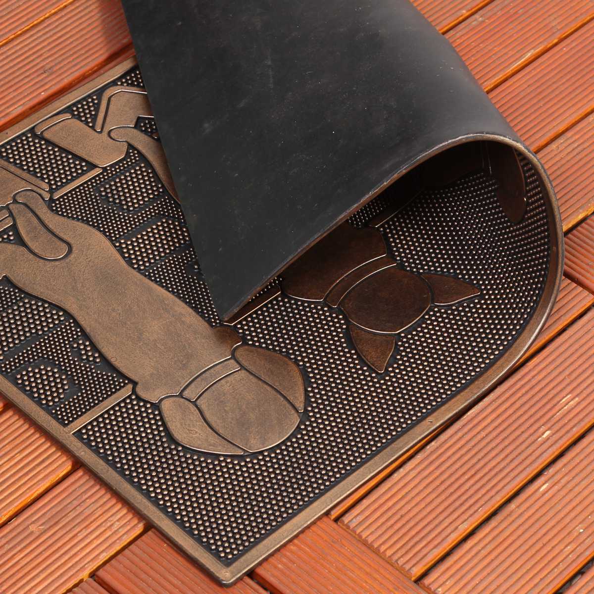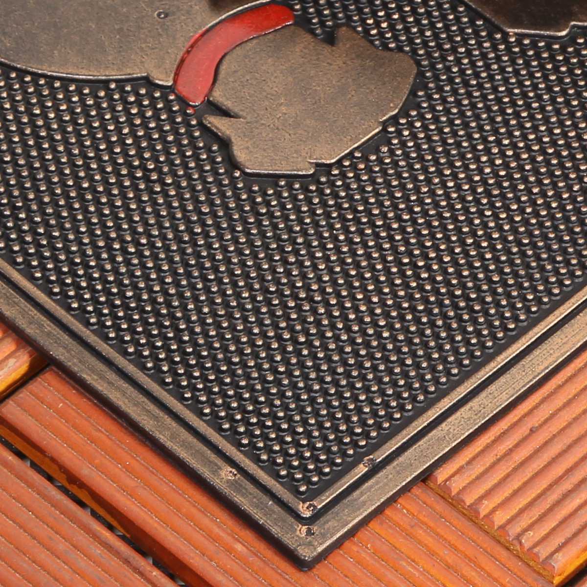 立体感のあるブロンズ調デザインが特徴的な屋内・屋外兼用玄関マットです。ヴィンテージ風の加工で金属の質感をリアルに再現し、ゴム製ながら高級感のある仕上がりになっています。デザイン性と実用性を兼ね備え、玄関をおしゃれに演出します。