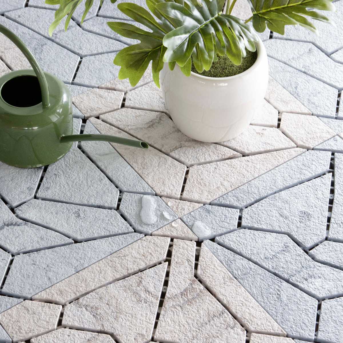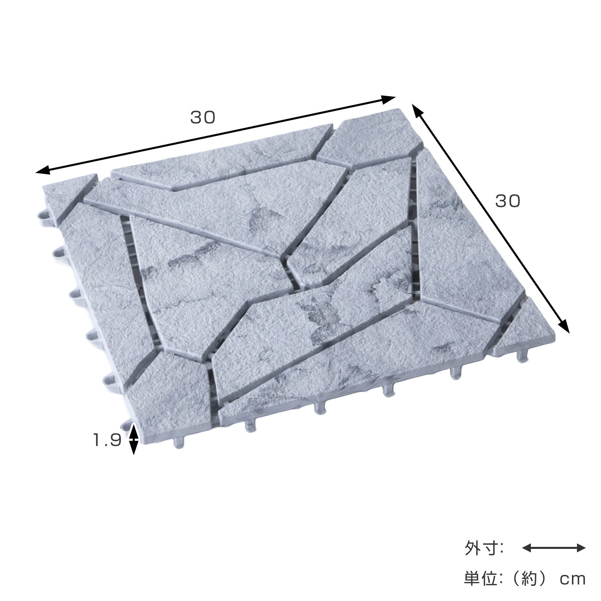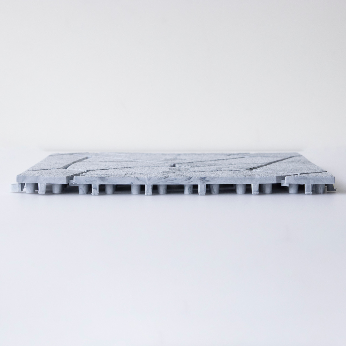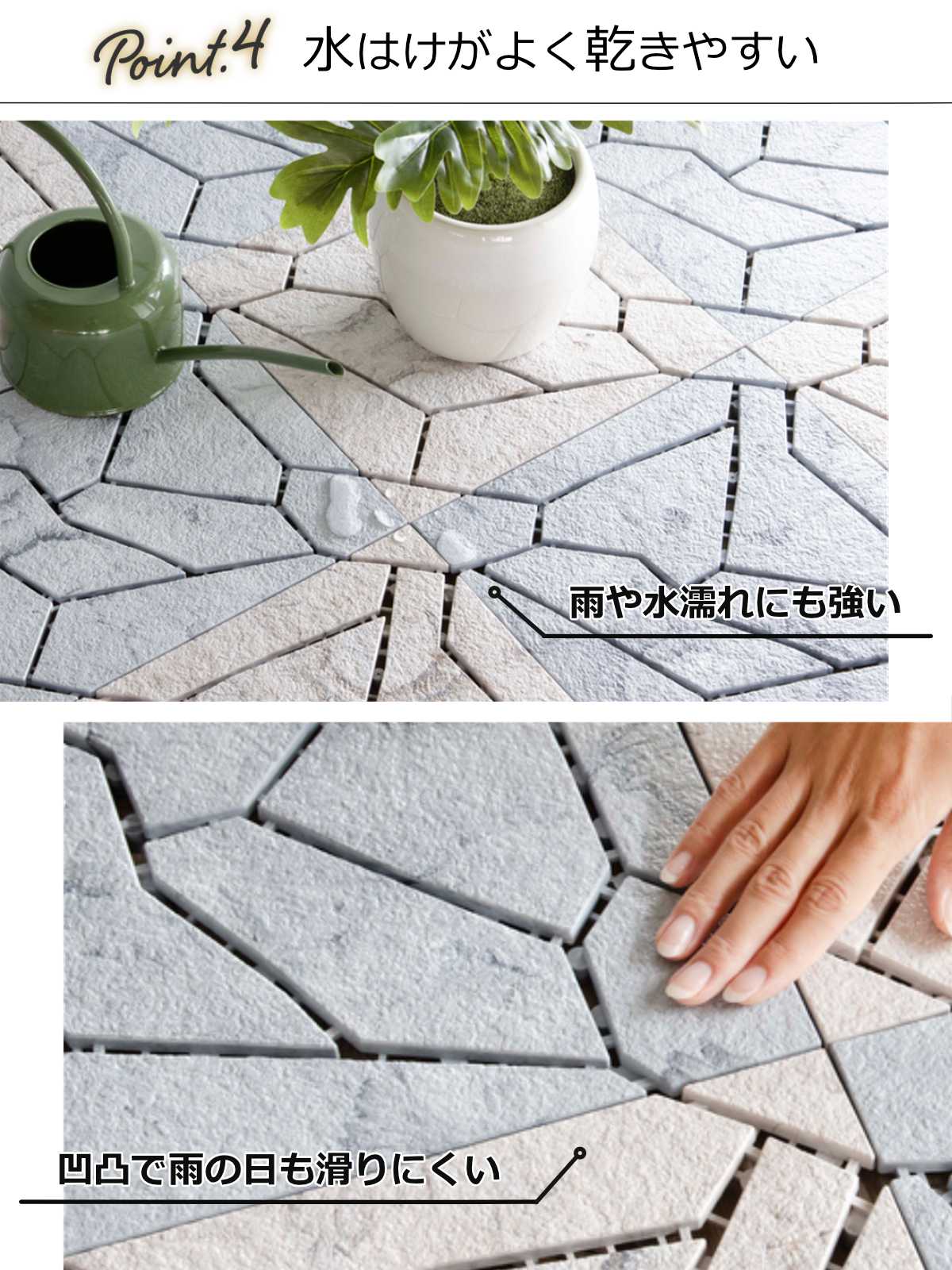 タイルの隙間から水が自然に抜ける設計で、雨や水濡れにも強く、表面は乾きやすく快適にお使いいただけます。汚れても水洗いで簡単にお手入れでき、表面の凹凸により雨の日でも滑りにくく安心です。安心・安全の日本製です。