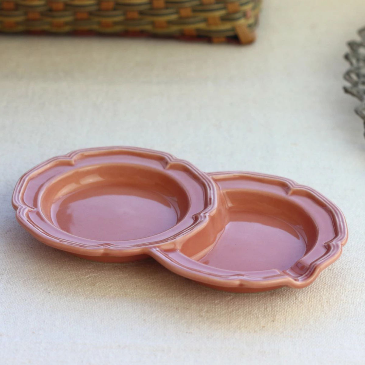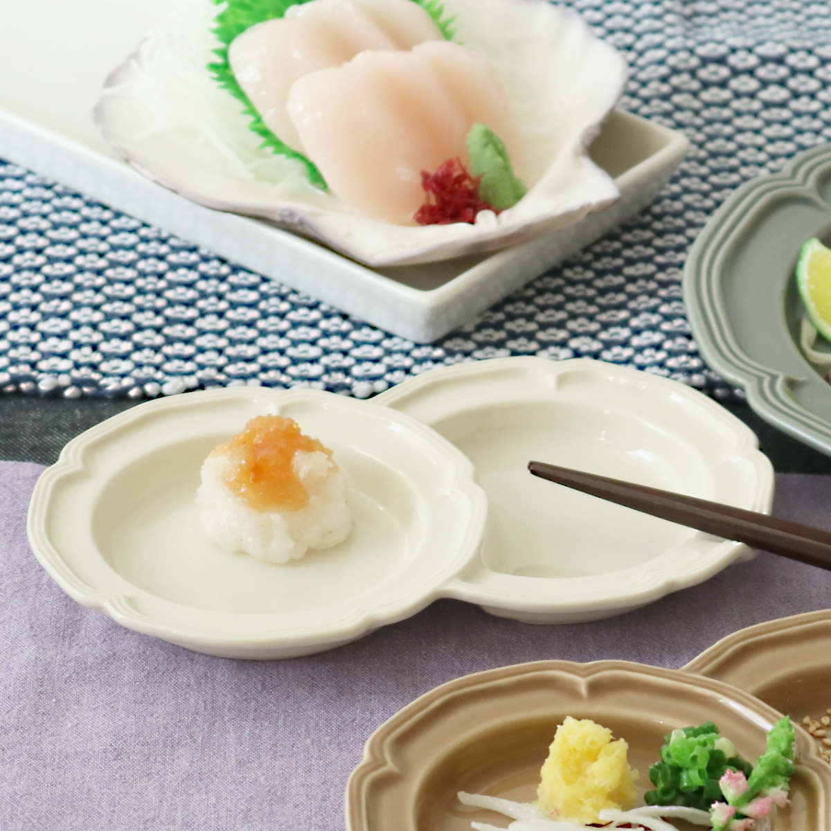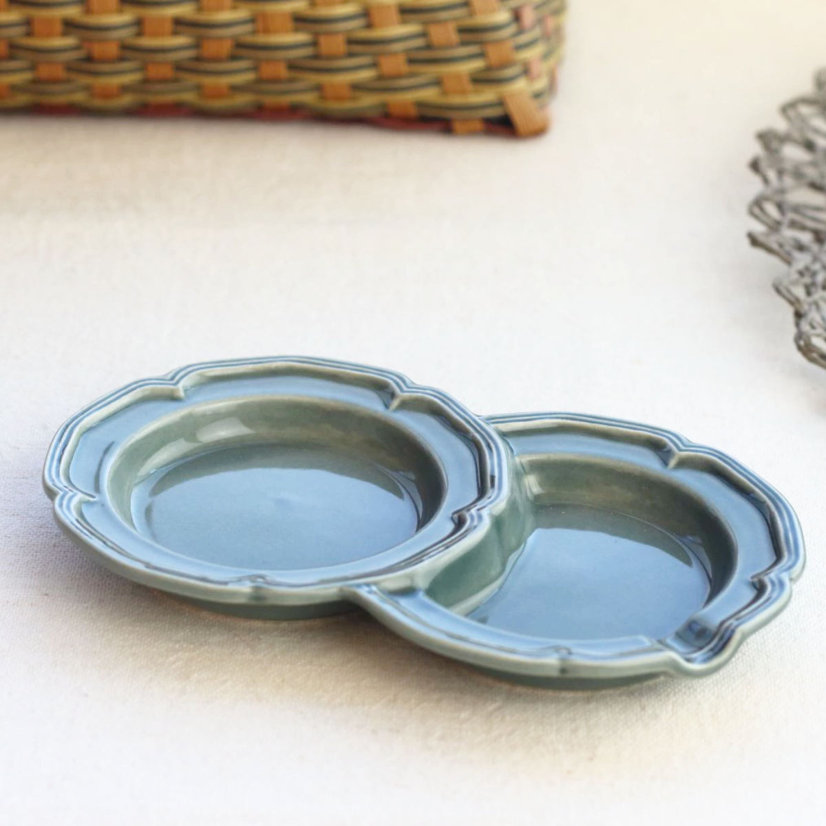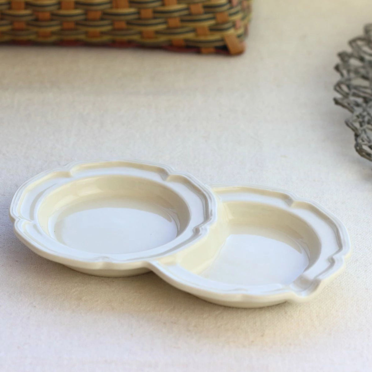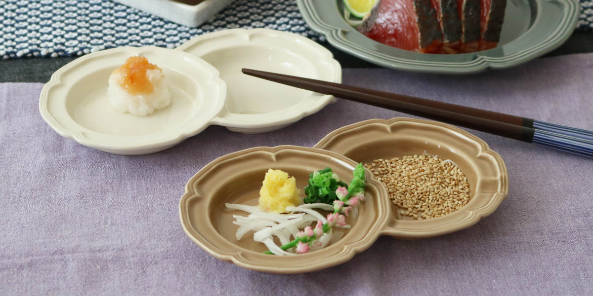 小さなプレートが2つ連なったデザインです。副菜を2品盛り付けたり、薬味とお醤油を分けて使ったり、混ざらずに盛り付けられます。