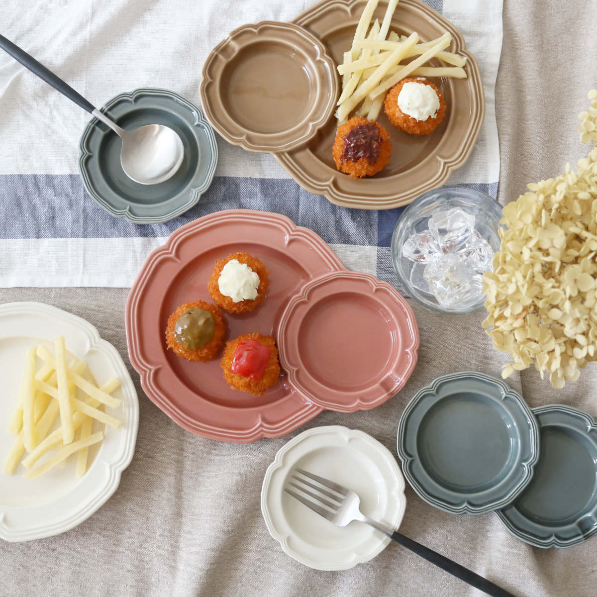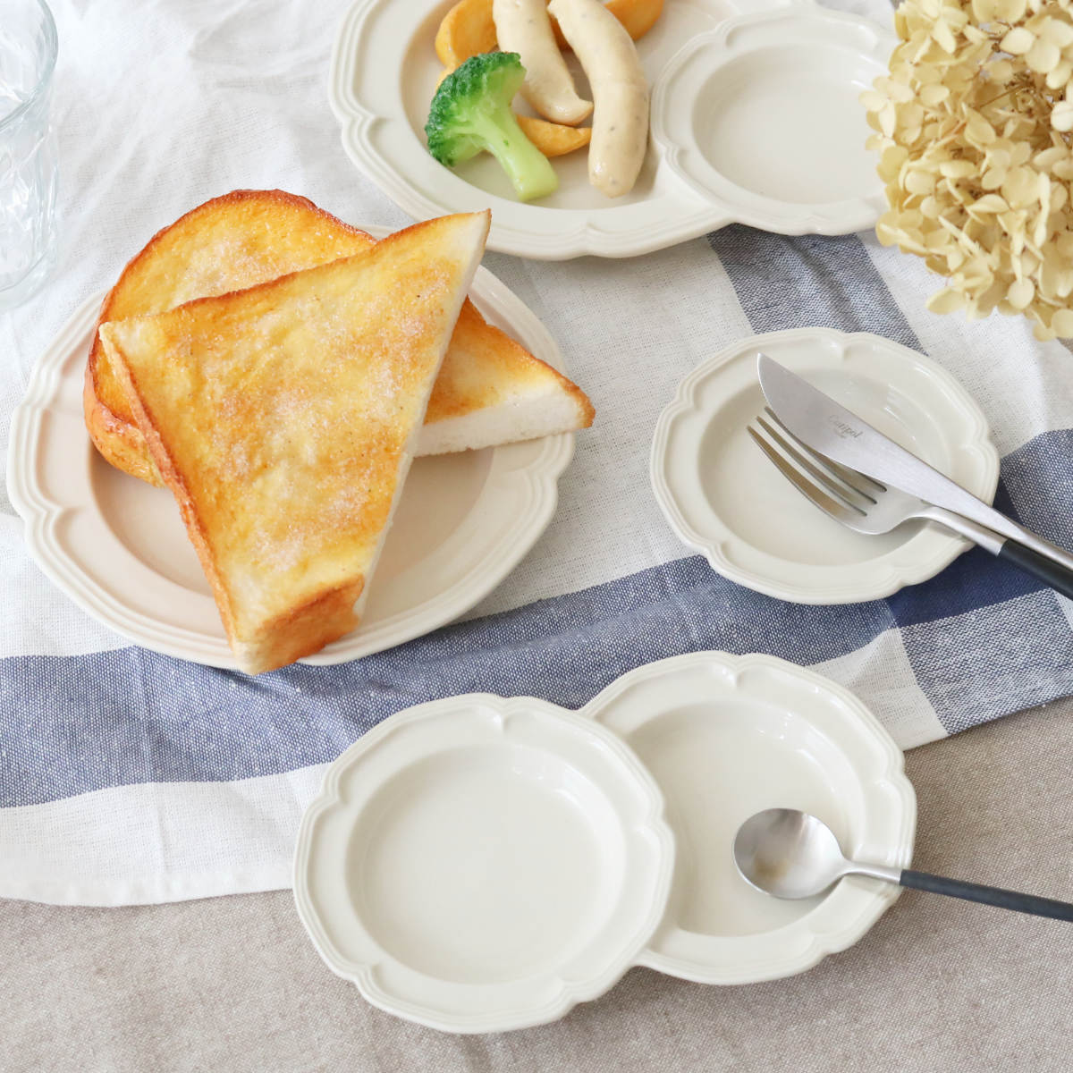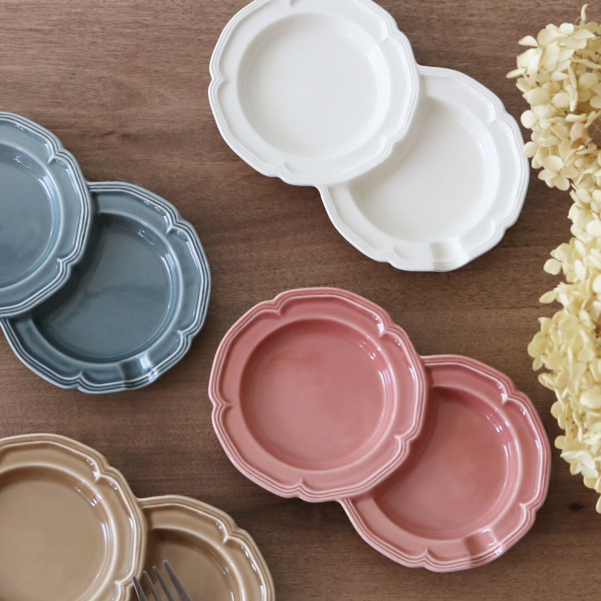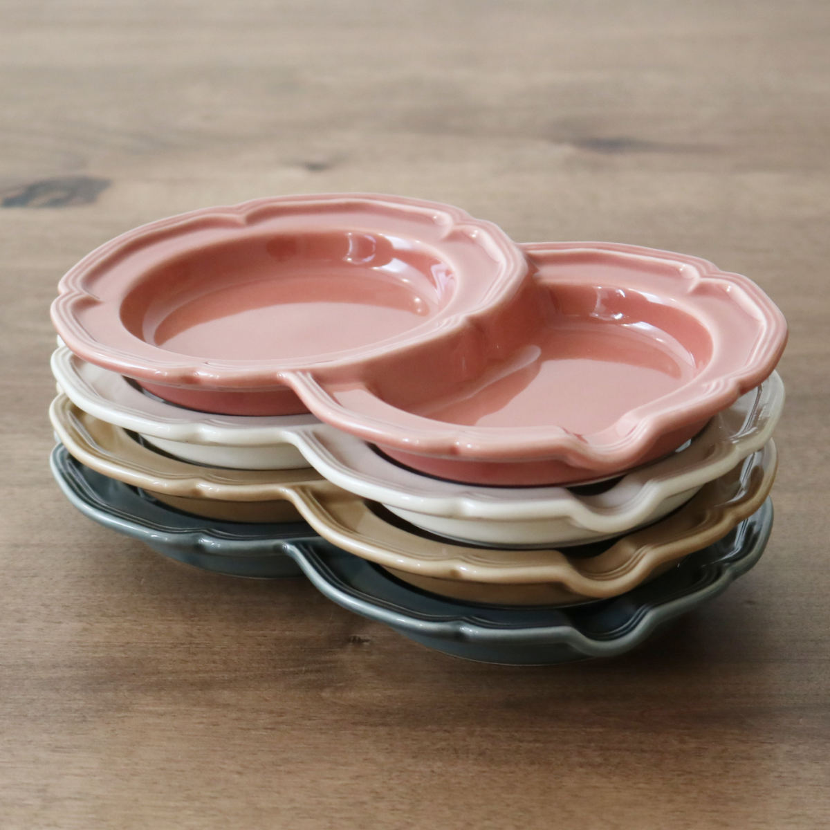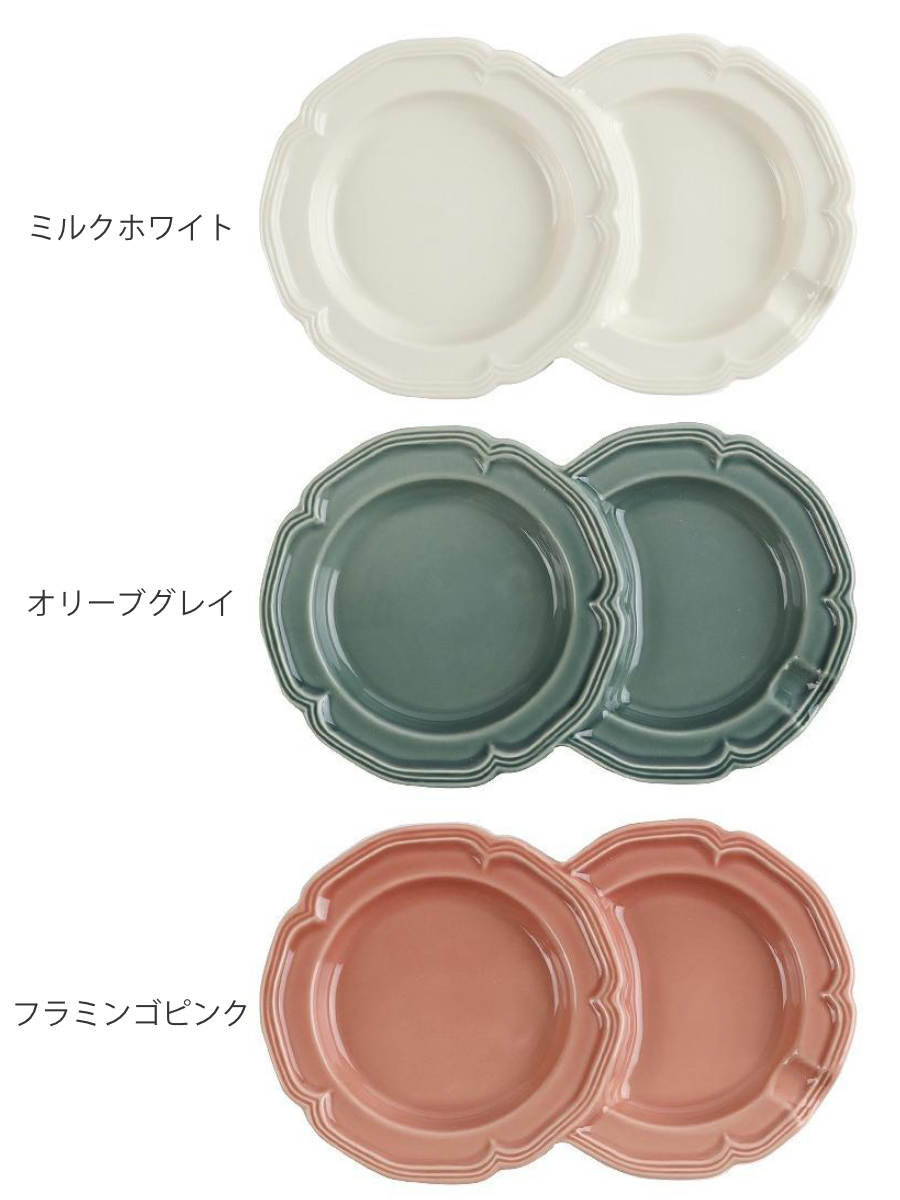 花の形をモチーフにした、やわらかで華やかなデザインが魅力。テーブルに並べるだけで、食卓がパッと明るく、かわいらしい雰囲気になります。日本有数の陶磁器の産地・愛知県瀬戸市で作られた日本製の器です。