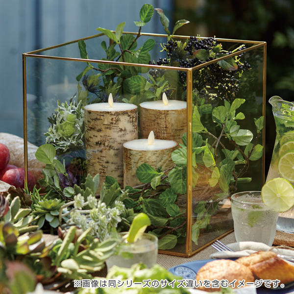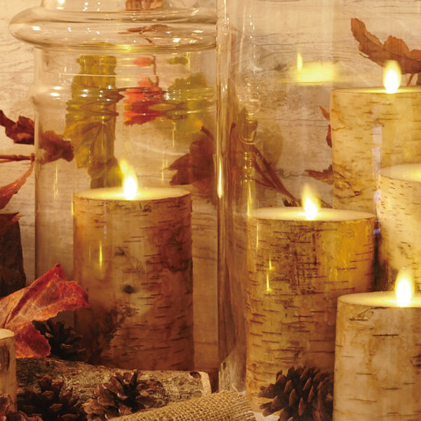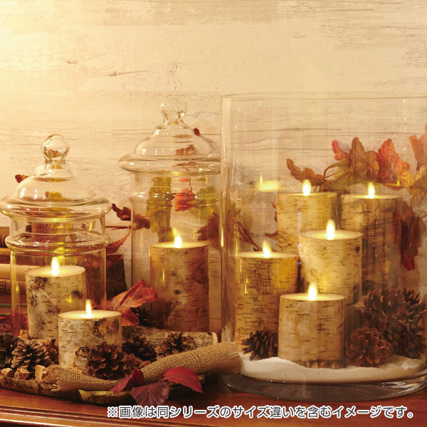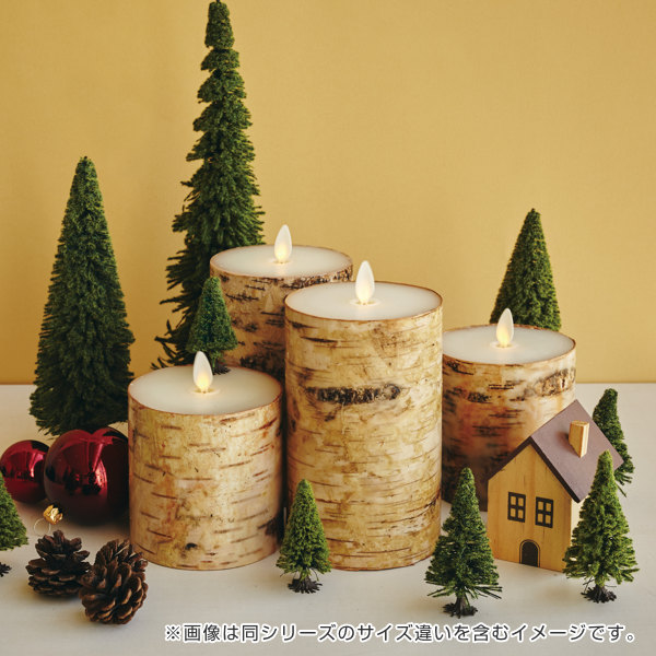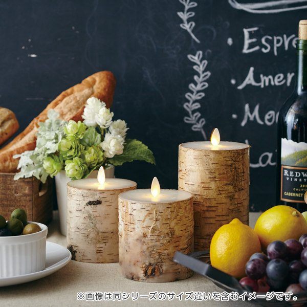 | 安心・安全 見た目は本物のキャンドルのようですがLEDで再現した炎のため、触ったり倒したりしても大丈夫です。安心・安全にお使いいただけます。 | 白樺の木が雰囲気づくりに 白樺の皮を周りに巻いているので、ナチュラルで上質な雰囲気が空間を引き立てます。 |