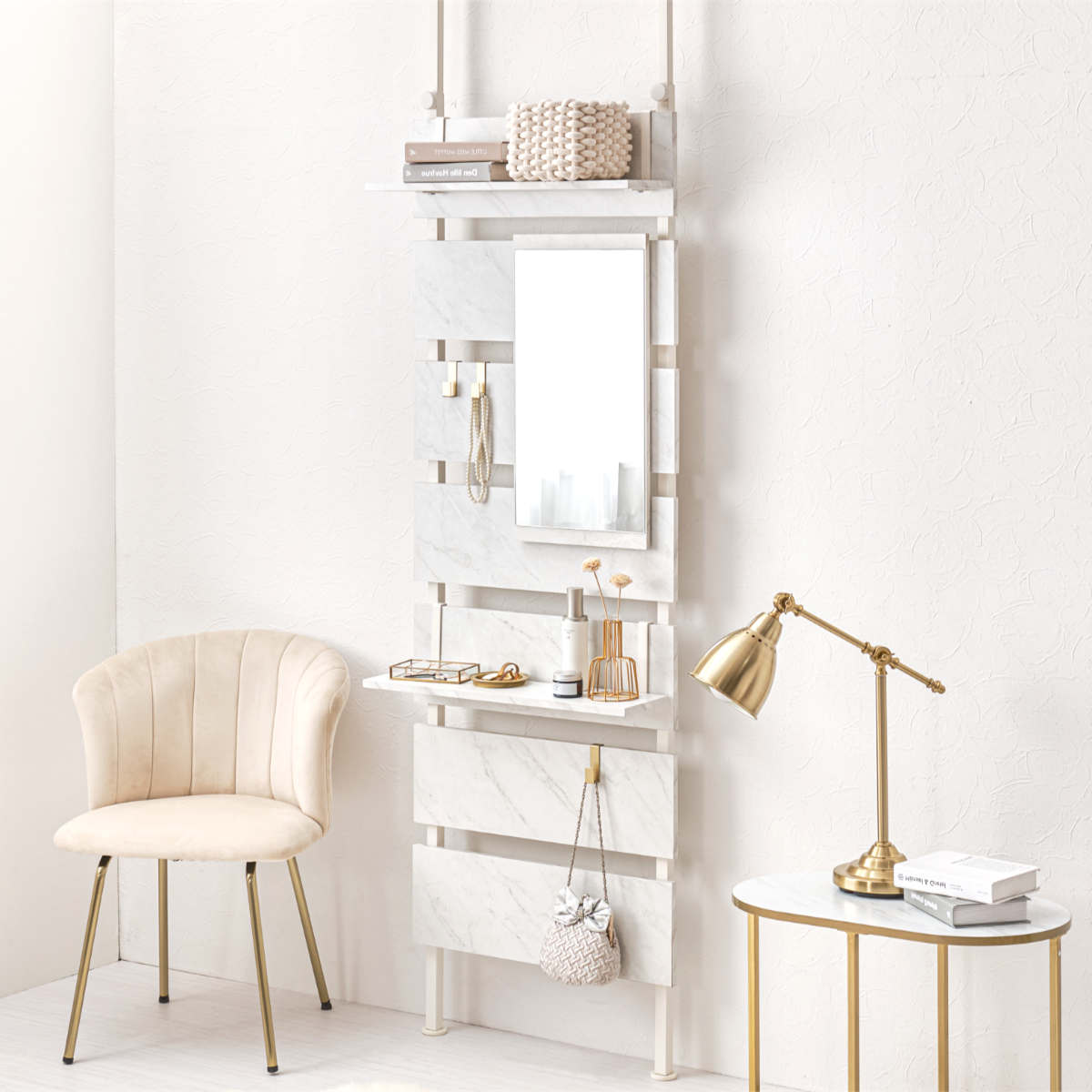 壁面に設置できる突っ張り式のウォールラックです。ミラーと棚板、フックが付属しているので、設置するだけで手軽に壁面にメイクスペースが出来上がります。天井や壁に穴を空けるなどの工事が不要なので、賃貸住宅にお住まいの方にもおすすめです。