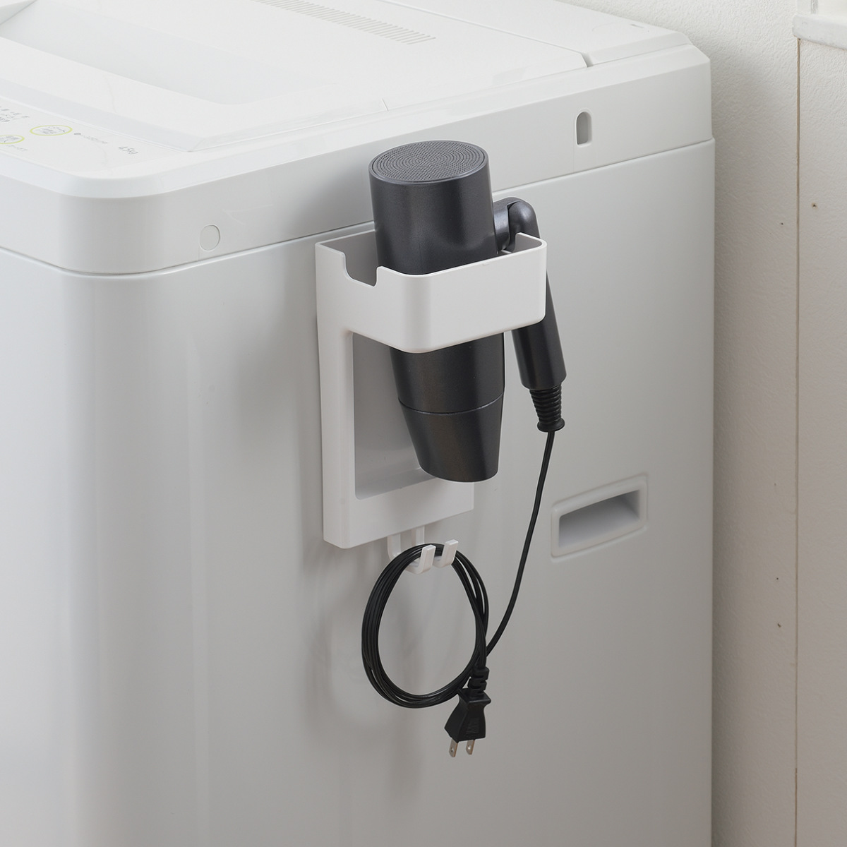 マグネットで簡単に取り付けができるフック付きドライヤーホルダーです。省スペース設計なので洗濯機横の隙間を活かし、置き場に困るドライヤーを浮かせてスッキリ収納できます。シンプルなデザインで、洗濯機周りをスッキリと整った印象にしてくれます。
