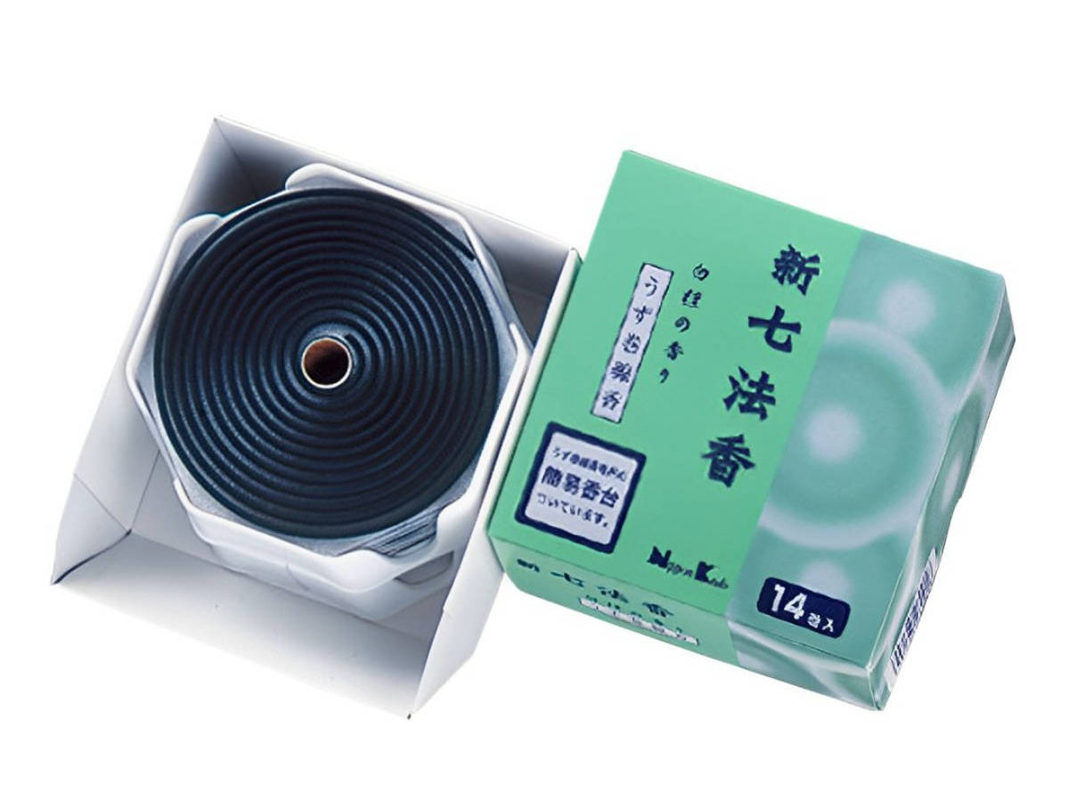 線香 渦巻き線香 新七法香 白檀 14巻入 ( お線香 渦巻線香 香台付き 12時間燃焼 お供え 初七日 お通夜 葬儀 四十九日 供養 御霊前 御仏前 神仏用 自宅用 日本香堂 )