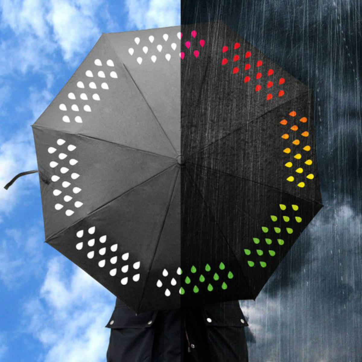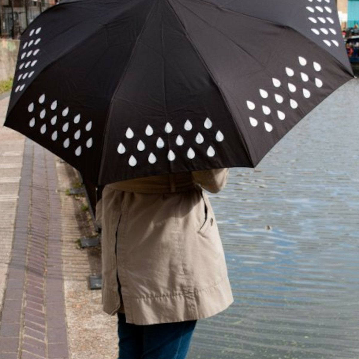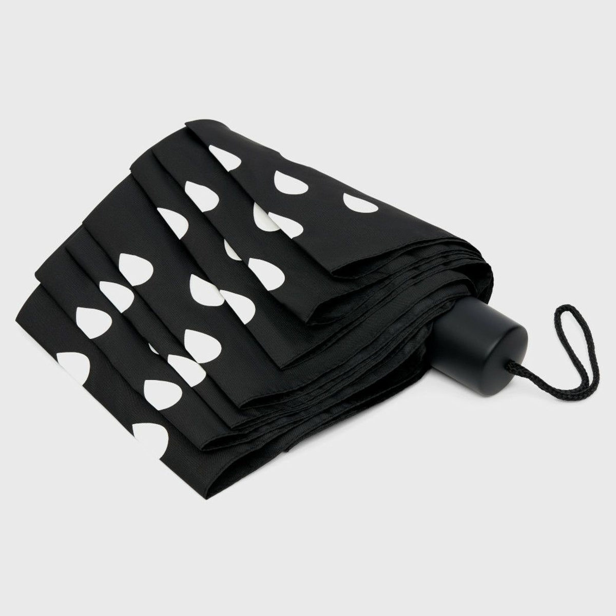 黒い生地に、白いプリントが入ったおしゃれな折り畳み傘。雨に濡れるとしずくの色がカラフルに変わって、乾くと元の白に戻ります。魔法みたいな傘で、どんより天気も楽しい気分で過ごせます。