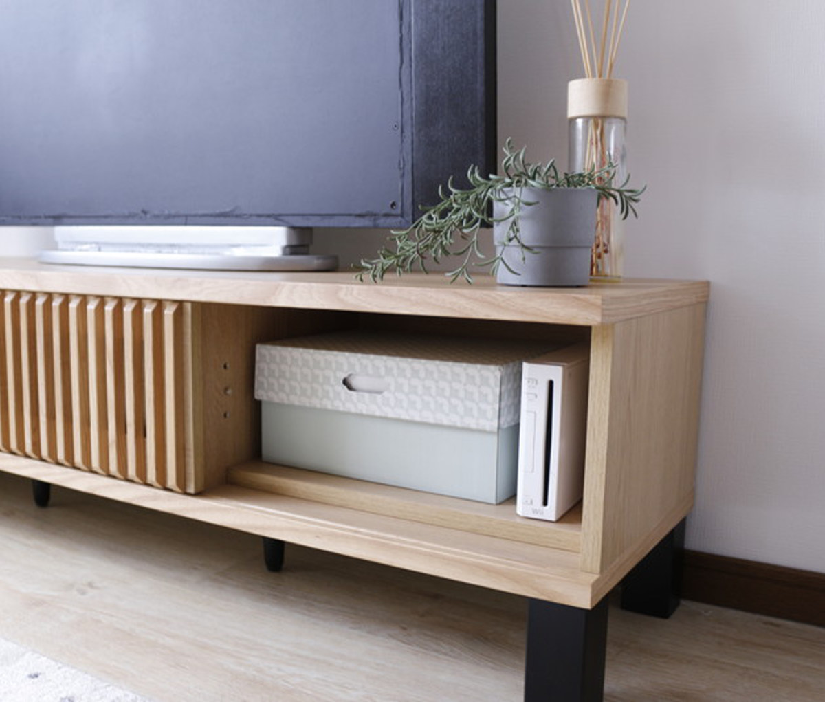扉は、スペースを取らない引き戸タイプです。棚板は可動式で、お手持ちのAV機器のサイズに合わせて高さを調節できます。取り外せばボックスやルーター等も収納OK。引き戸のルーバー部の内側にはガラスが入っているので、扉を閉めたままでもリモコンの操作が可能です。