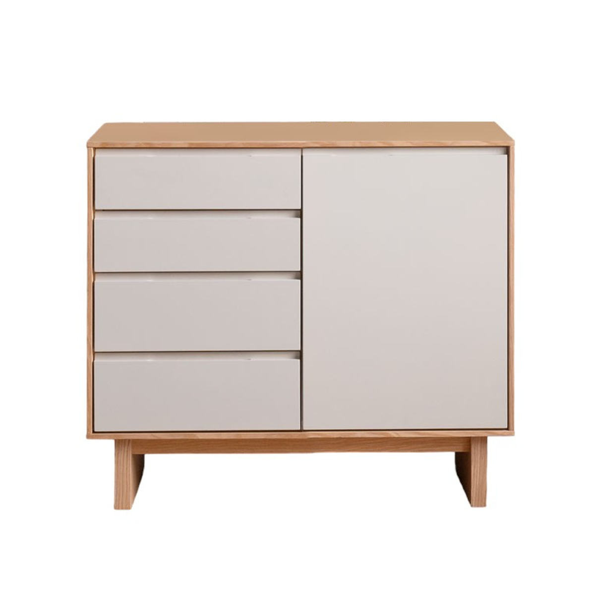 環境に配慮したFSC認証を取得した天然木工芸突板を使用したサイドボードです。ナチュラルなフレームとグレージュのツートンカラーが、空間に明るさと優しさをプラスします。隠す収納で生活感を与えず、すっきりと片付いた空間に。