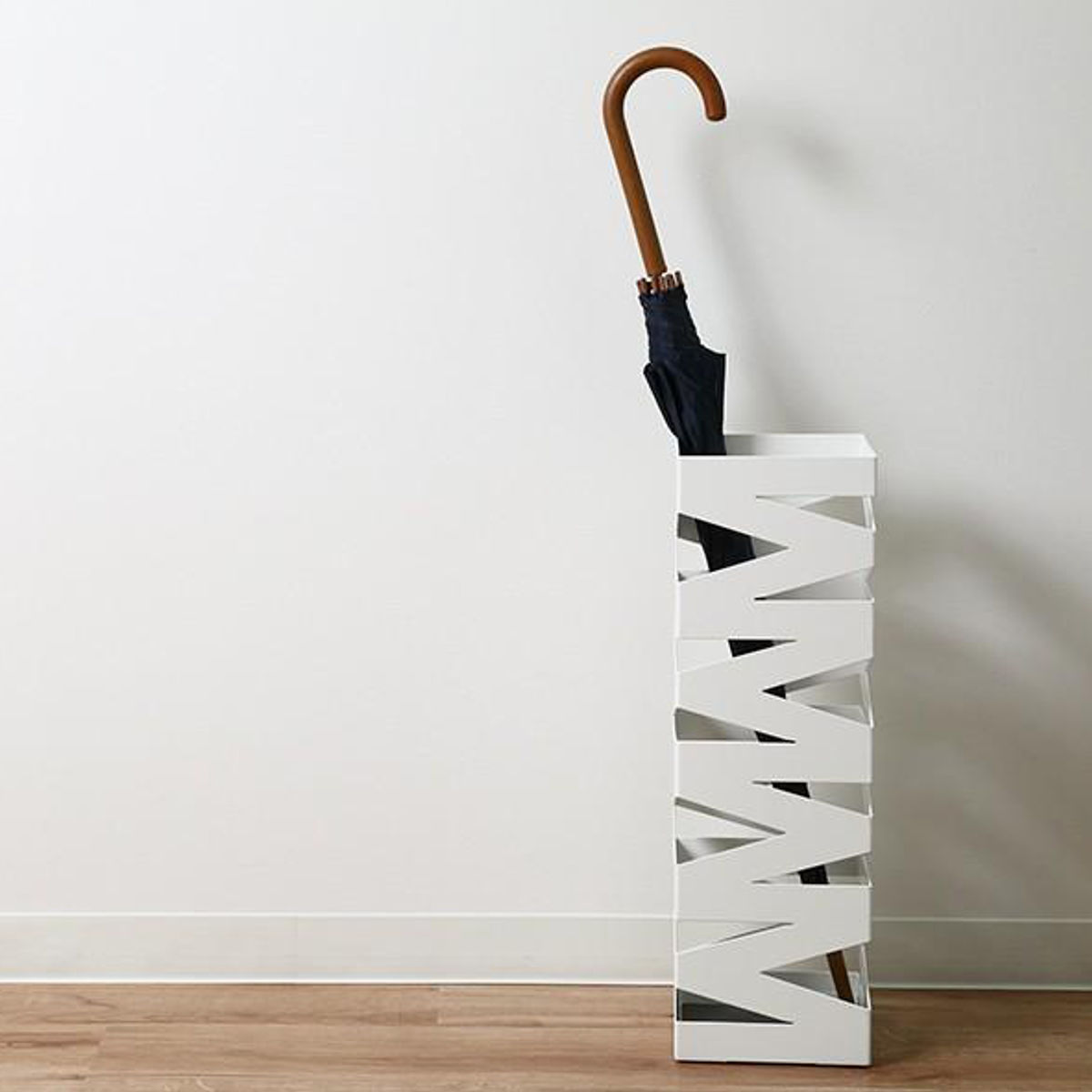 奥行15.3cmのスリムなスクエアタイプです。コーナーに置くと壁にフィットするので、置いても邪魔になりません。最大で約8本の傘を収納できるので、急な来客時も安心です。