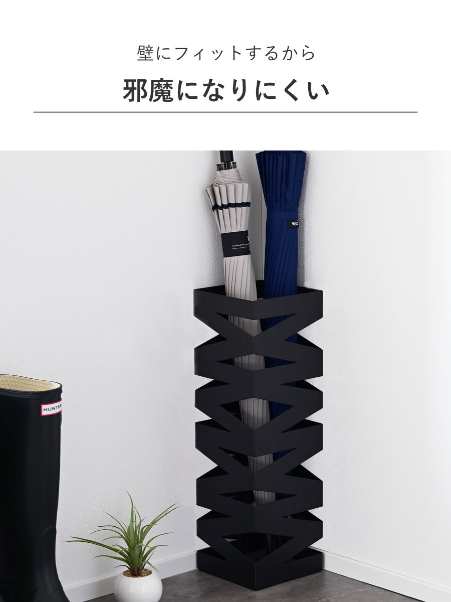奥行15.3cmのスリムなスクエアタイプです。コーナーに置くと壁にフィットするので、置いても邪魔になりません。最大で約8本の傘を収納できるので、急な来客時も安心です。