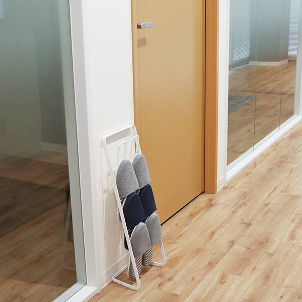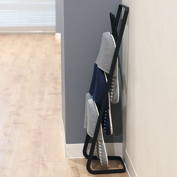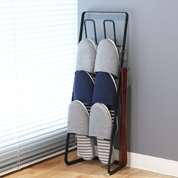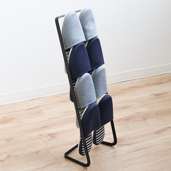 奥行き15.5cmとスリムですが安定感のあるしっかりとしたつくりなので倒れにくく、内側のフレームにはスリッパの出し入れがしやすい角度設計がされており、使いやすいさと機能性を重視しています。スリッパは4足収納可能なので、ご夫婦・ご家族でもお使いいただけます。