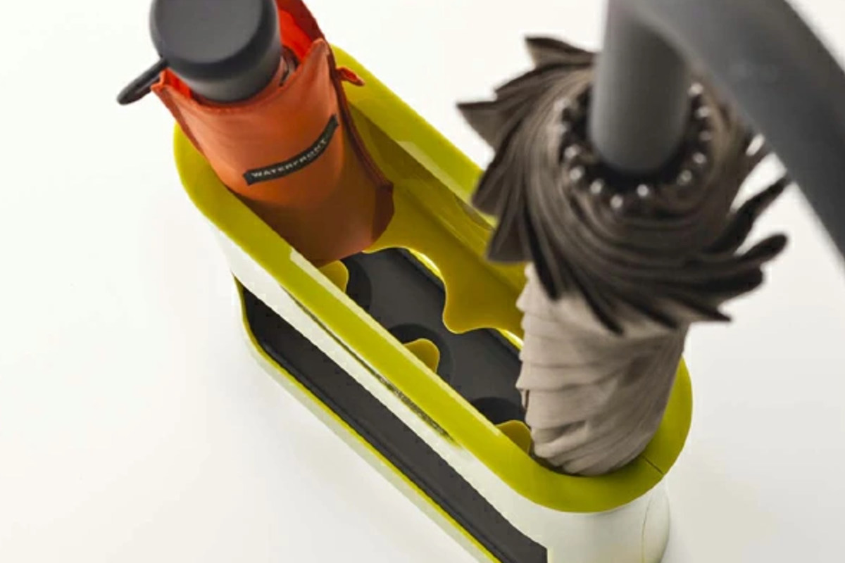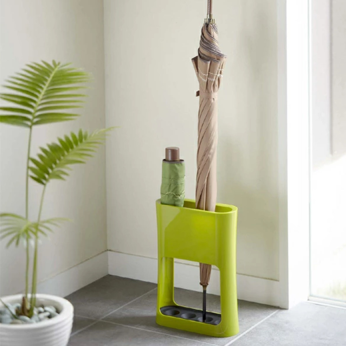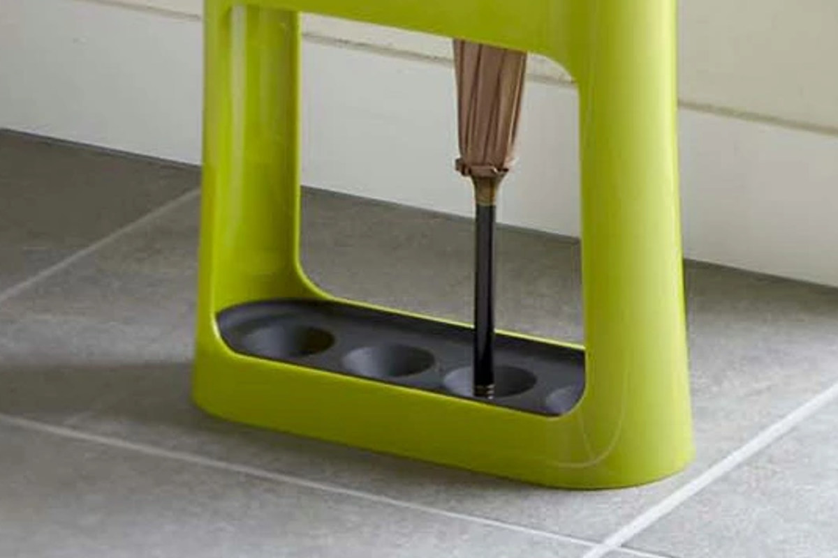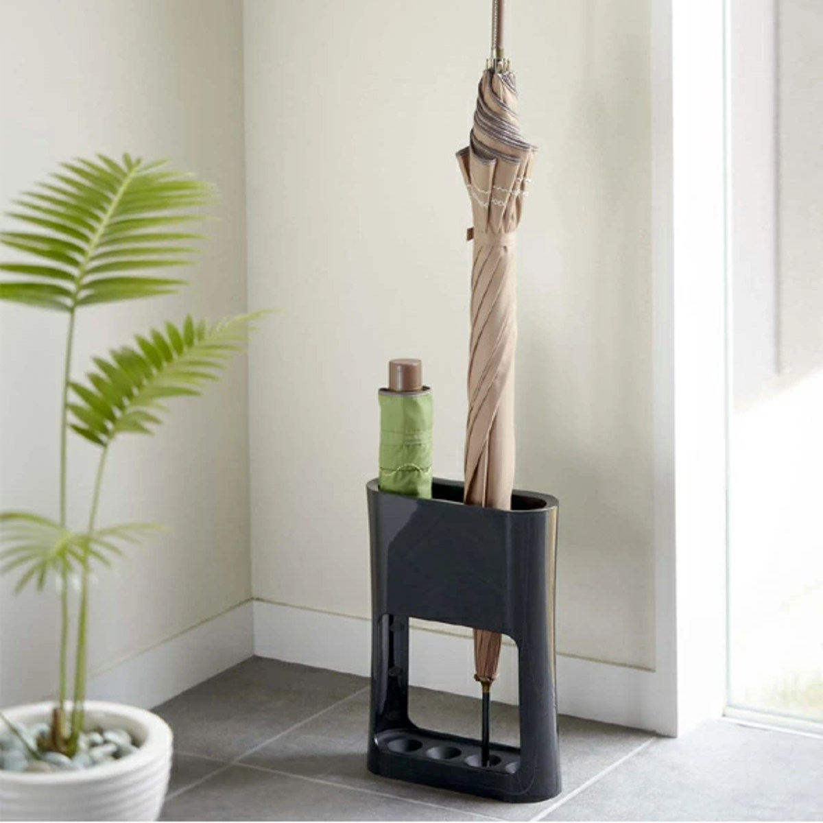 下のトレーにくぼみがあるので、傘の先がハマって横にずれにくくなっています。クタッと横にずれてしまう傘のあのストレスから開放されて、見た目も心もスッキリ。