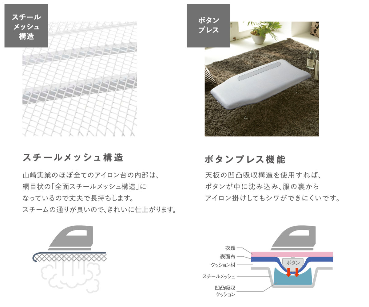 内部はアミ目状になったスチールメッシュ構造です。とても丈夫なスチール製なので熱に強く、丈夫で長持ちします。メッシュ構造は、スチームの通りがよく、パリッと美しい仕上がりを実現します。熱による歪みなどが生じにくく、長く使用できます。