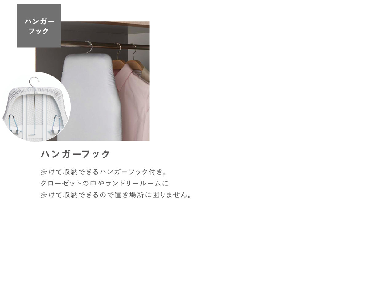 吊り下げに便利なフック付きです。使わない時は、ポールに引っ掛けることができるので場所を取らずに保管が可能です。