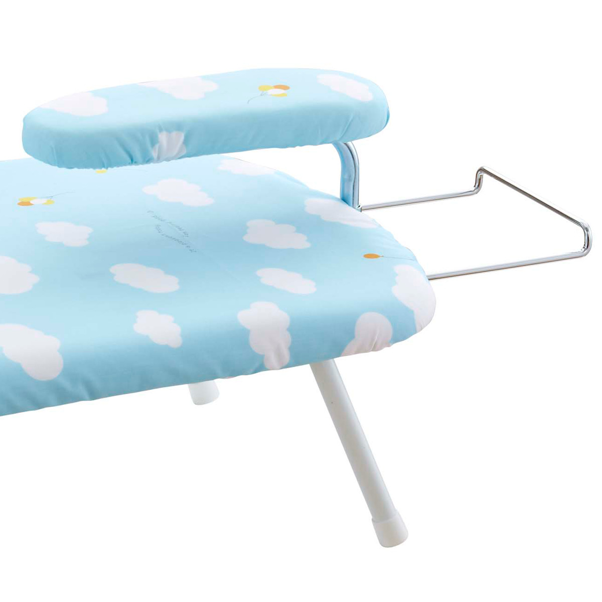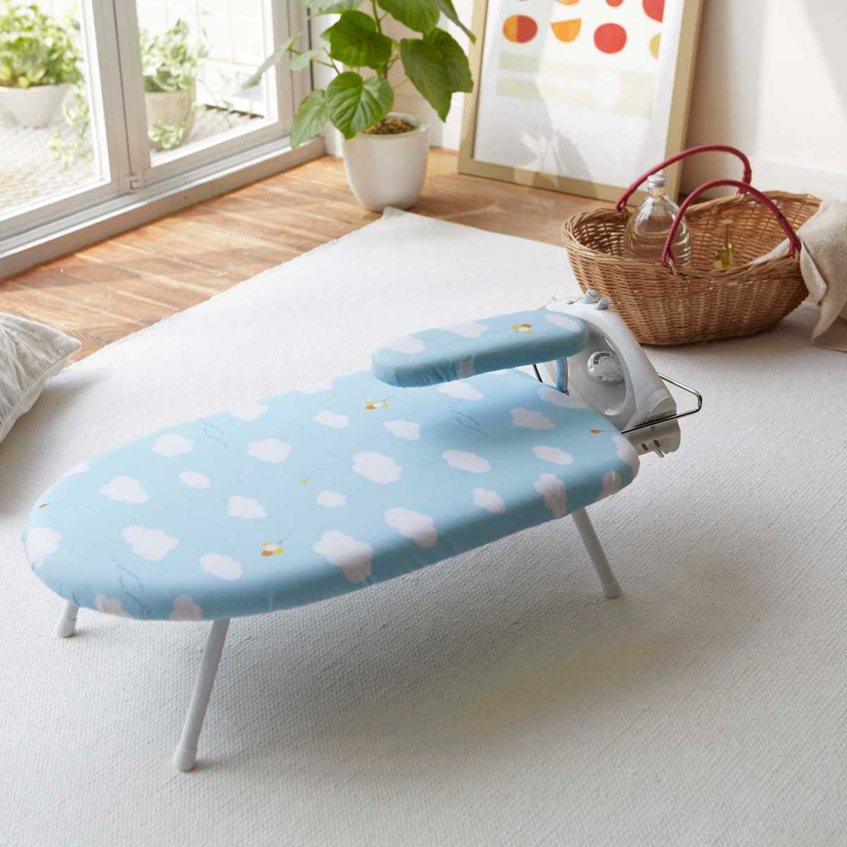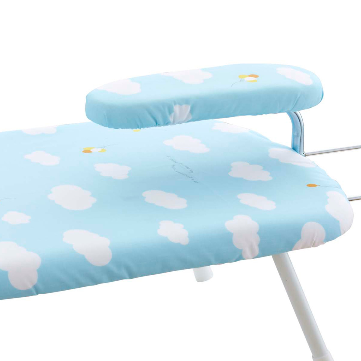 ふんわり優しいスカイブルーと雲の合間をゆったり気球が漂うデザインの座式アイロン台です。