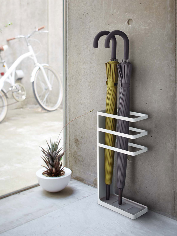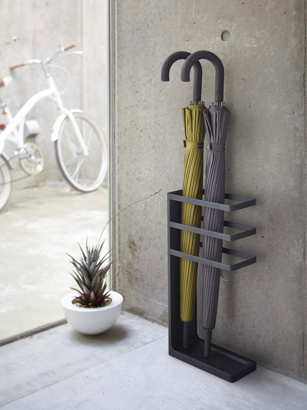 スチールフレームの組み合わせがスタイリッシュなデザインです。受け皿には簡単なストッパーがついているので傘の美しい立ち姿をキープしてくれます。普段使いはもちろん、靴箱などに収納できる大きさなので、来客用として準備しておくのもおすすめです。