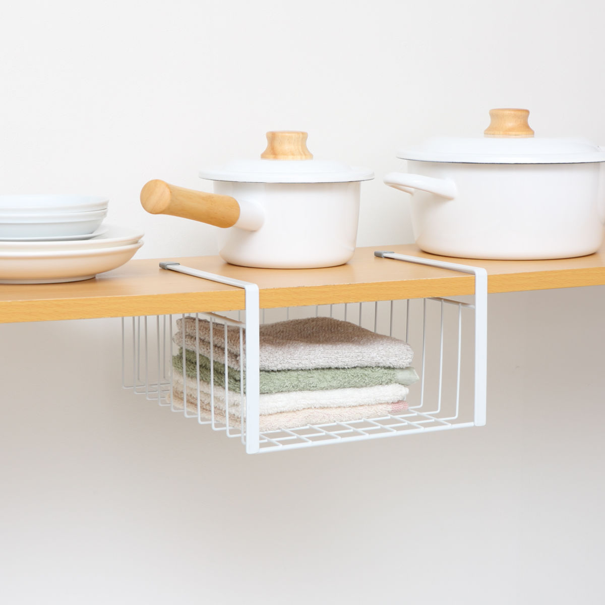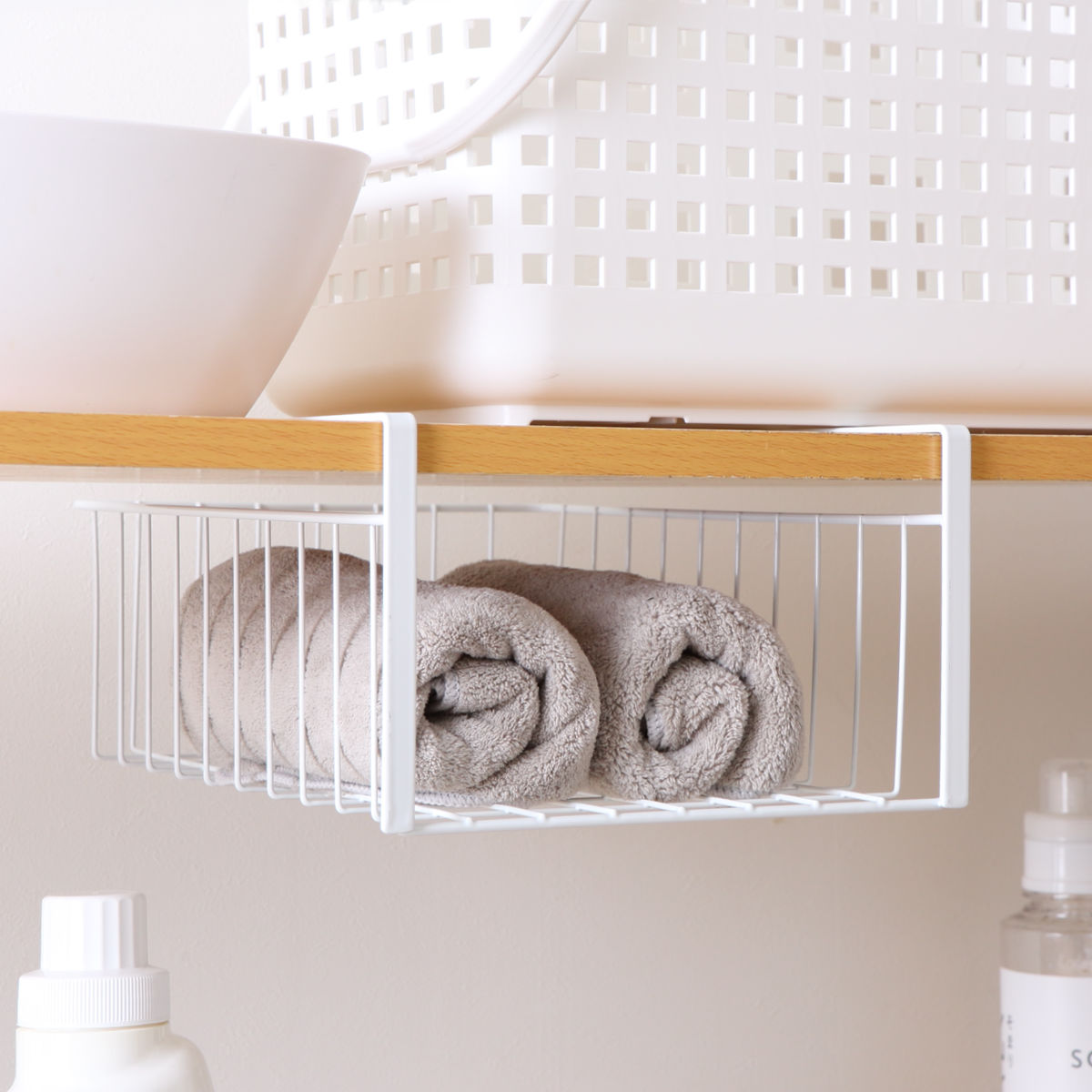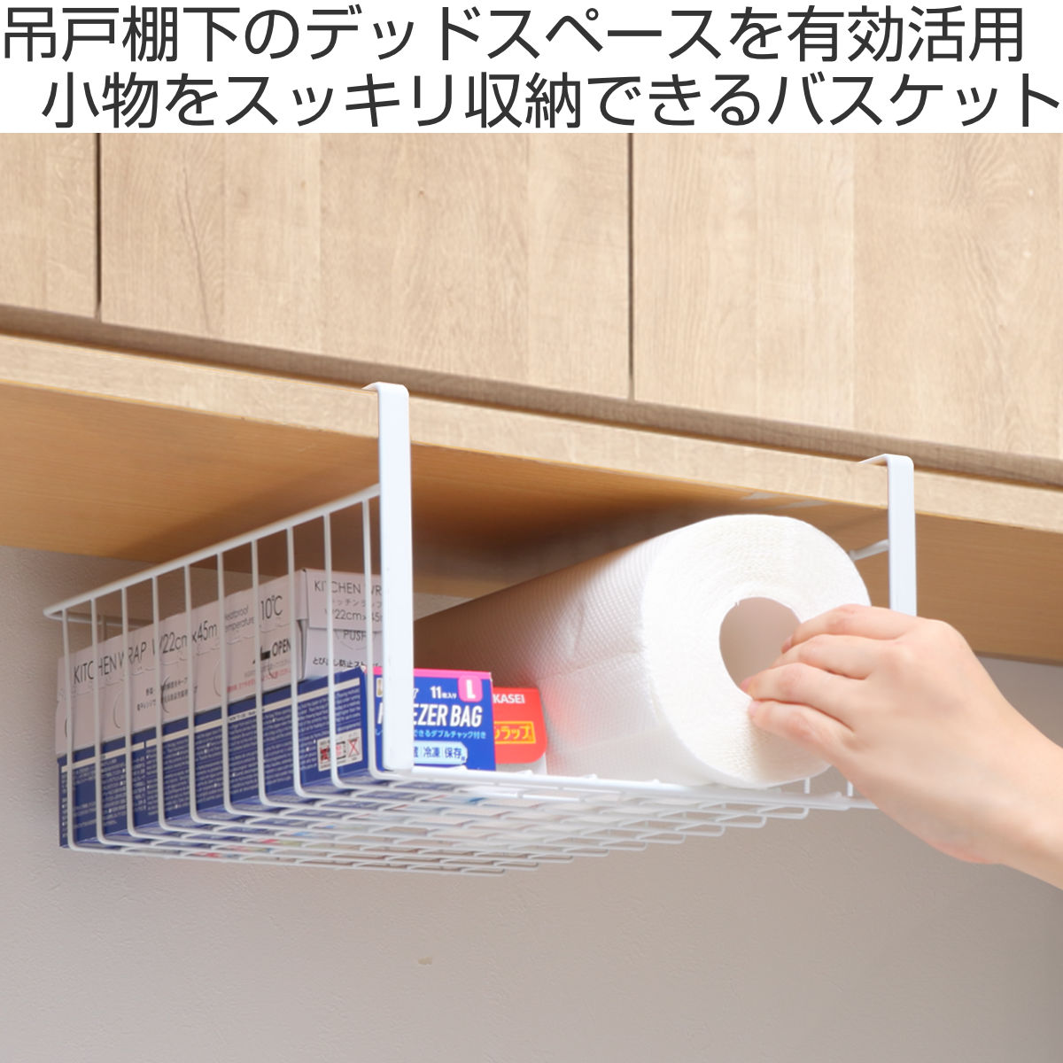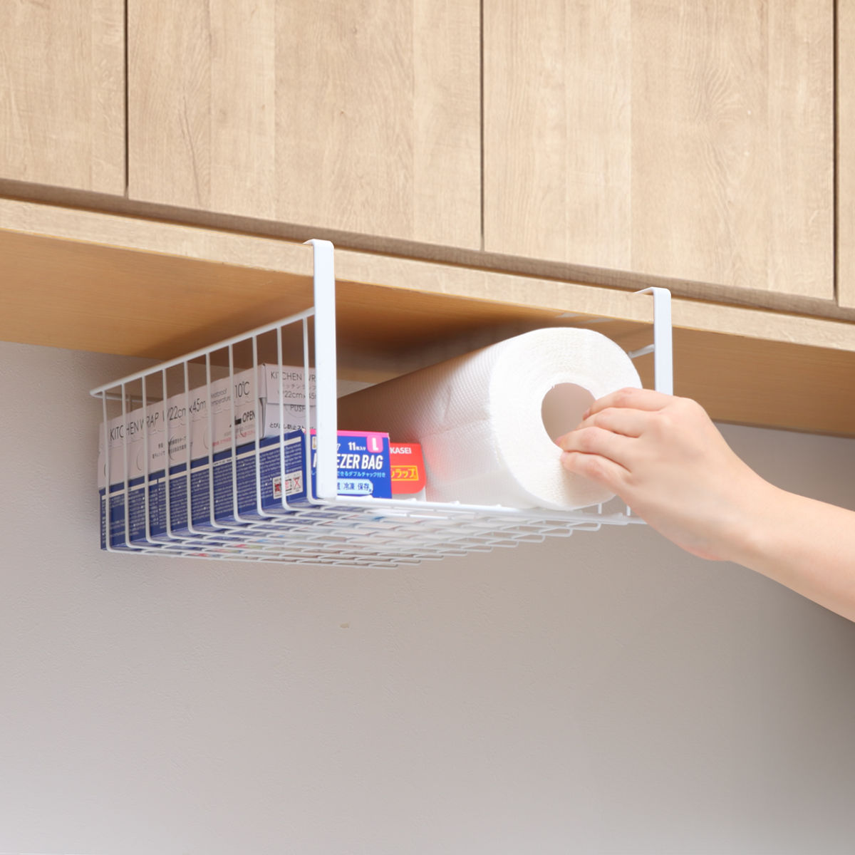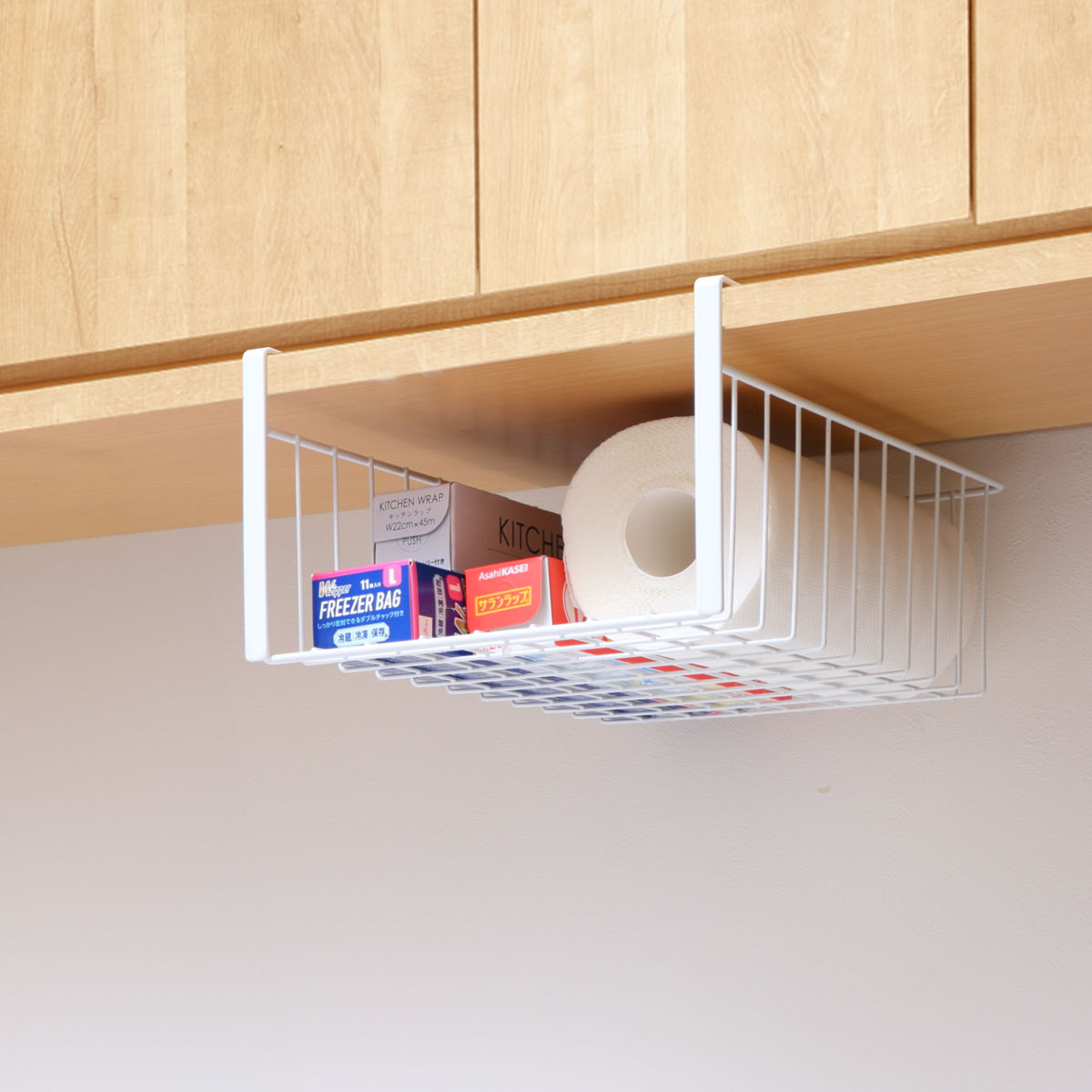 キッチンの吊戸棚下を収納スペースにできるワイヤーバスケットです。キッチンペーパーやラップなどキッチン周りの小物をスッキリ収納できます。