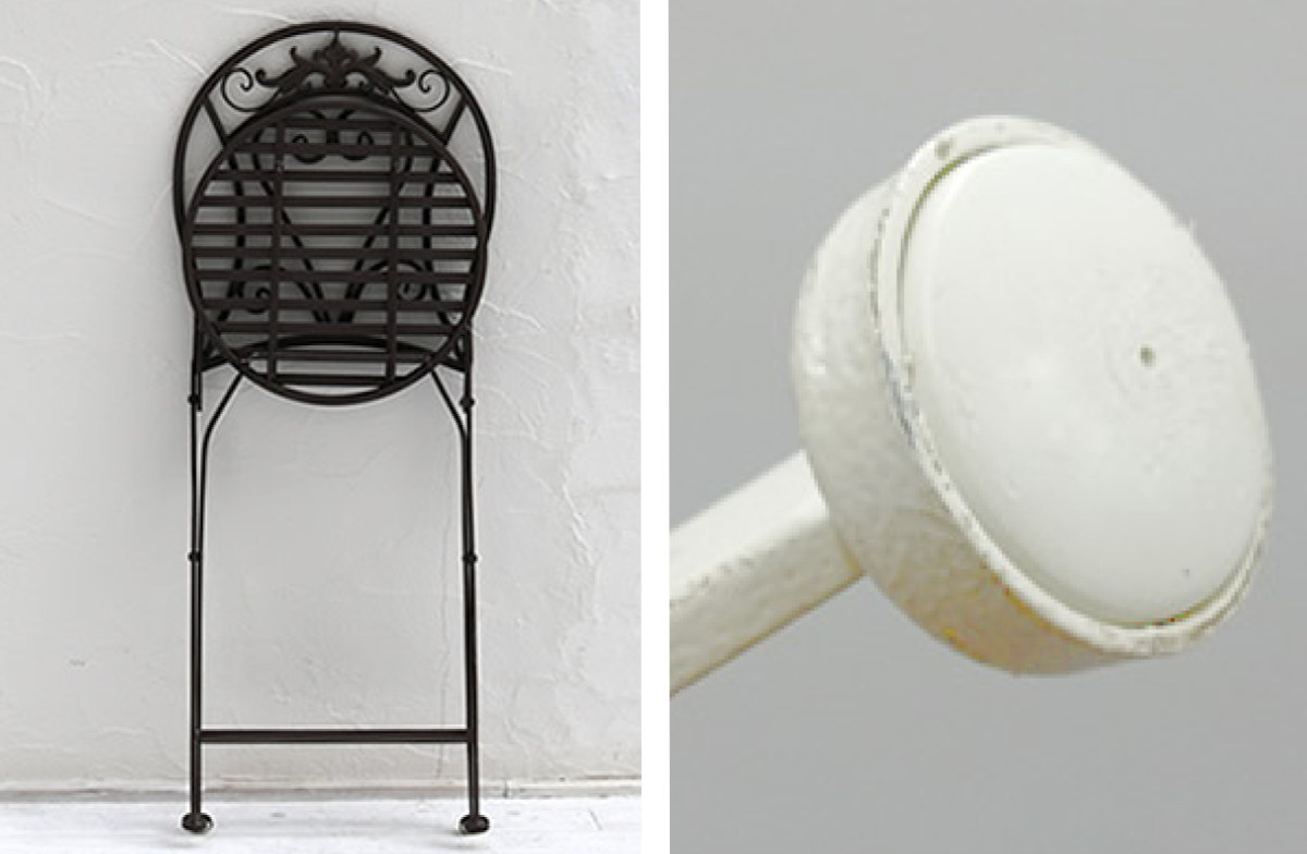 丸みを帯びた繊細なフォルムは、熟練職人のハンドメイド。一本一本のパイプを丁寧に曲げ、装飾と結ぶことで生まれる優美なラインは手仕事ならではの味わいです。塗装も全て手作業。白を塗り重ねた上から黒を重ねる二重工程で、アンティークなシャビー感と深みを表現します。手間を惜しまぬ仕上げが、空間に溶け込みながらも存在感を放ちます。