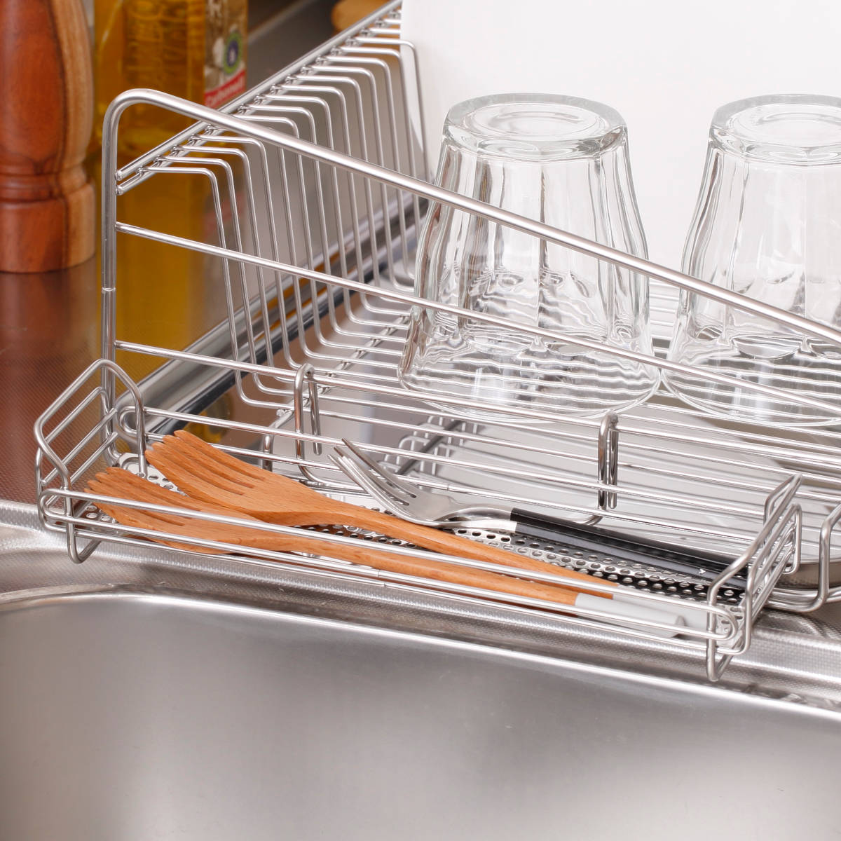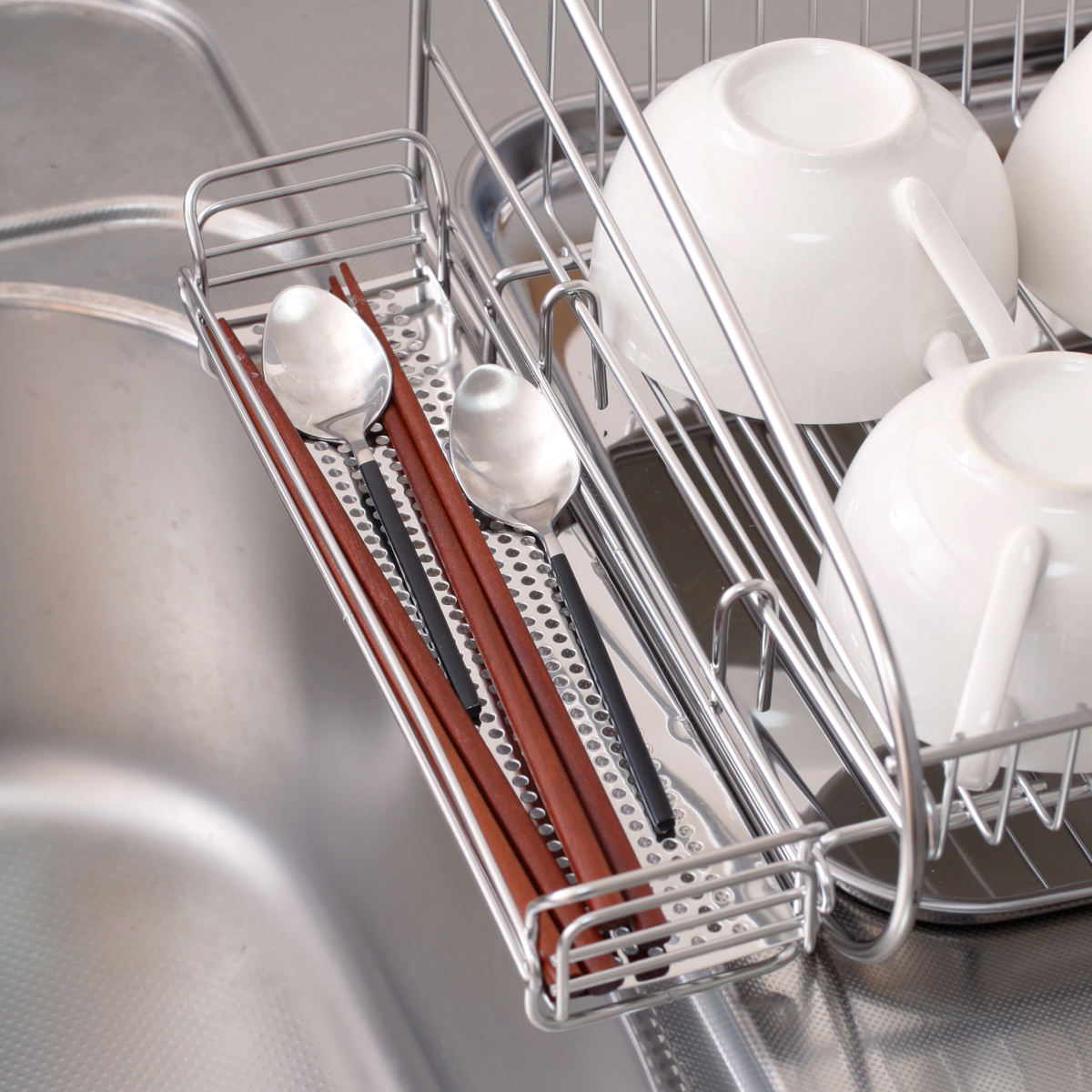 カトラリーやお箸を寝かせて置けるため、水切りしやすく衛生的。柄の太いツールも、縦に差し込むタイプのようにポケットが埋まってしまうことなく、すっきり水切りできます。