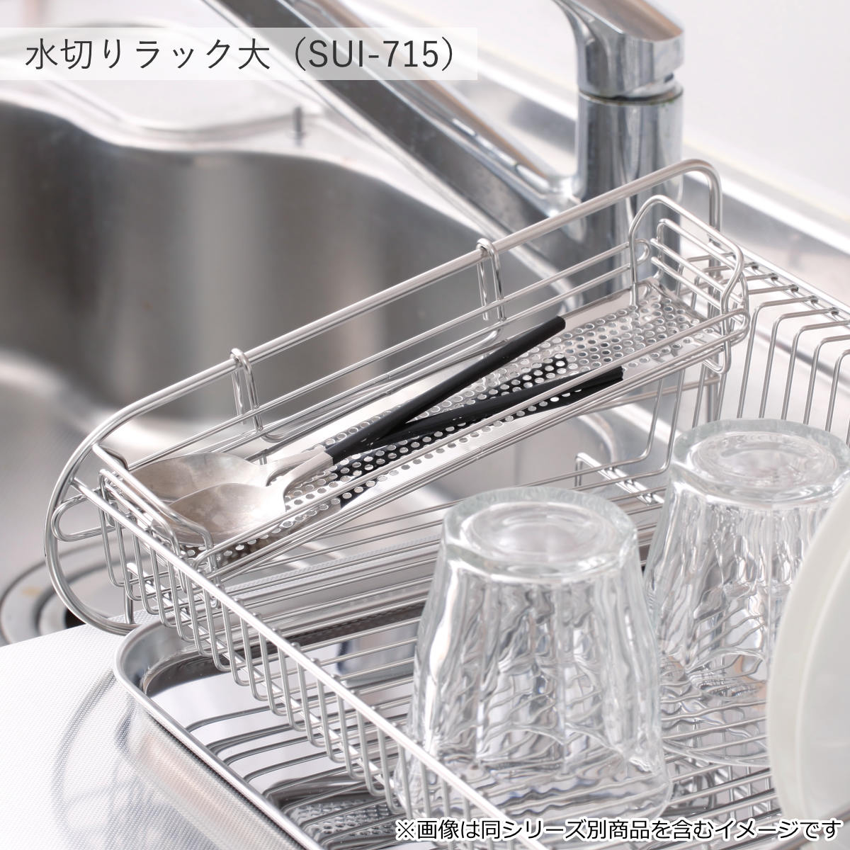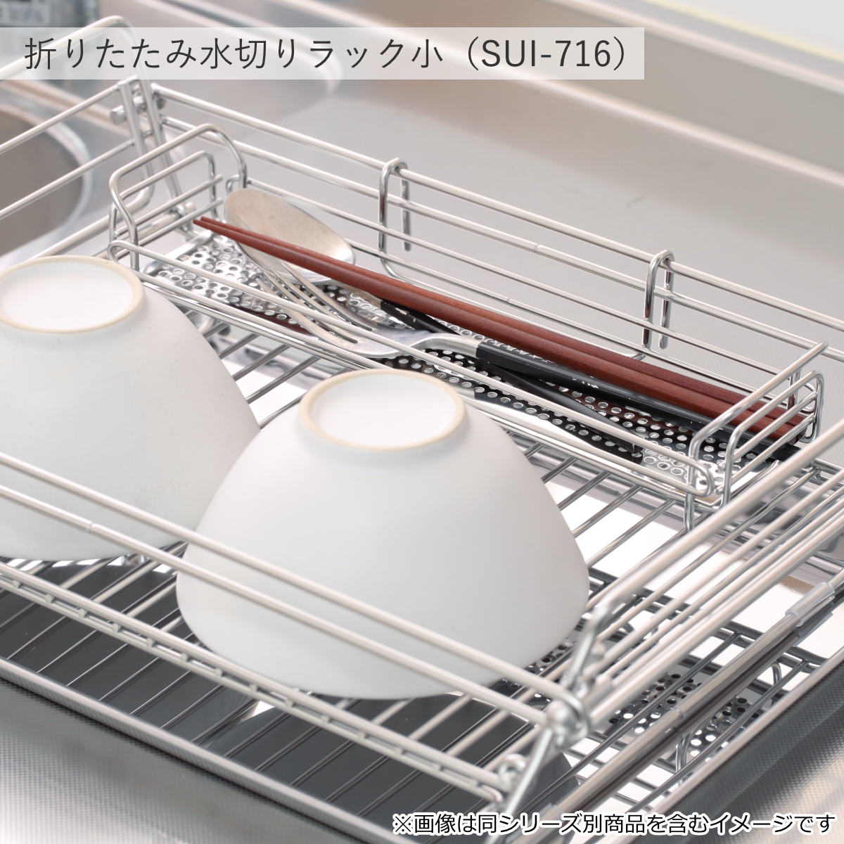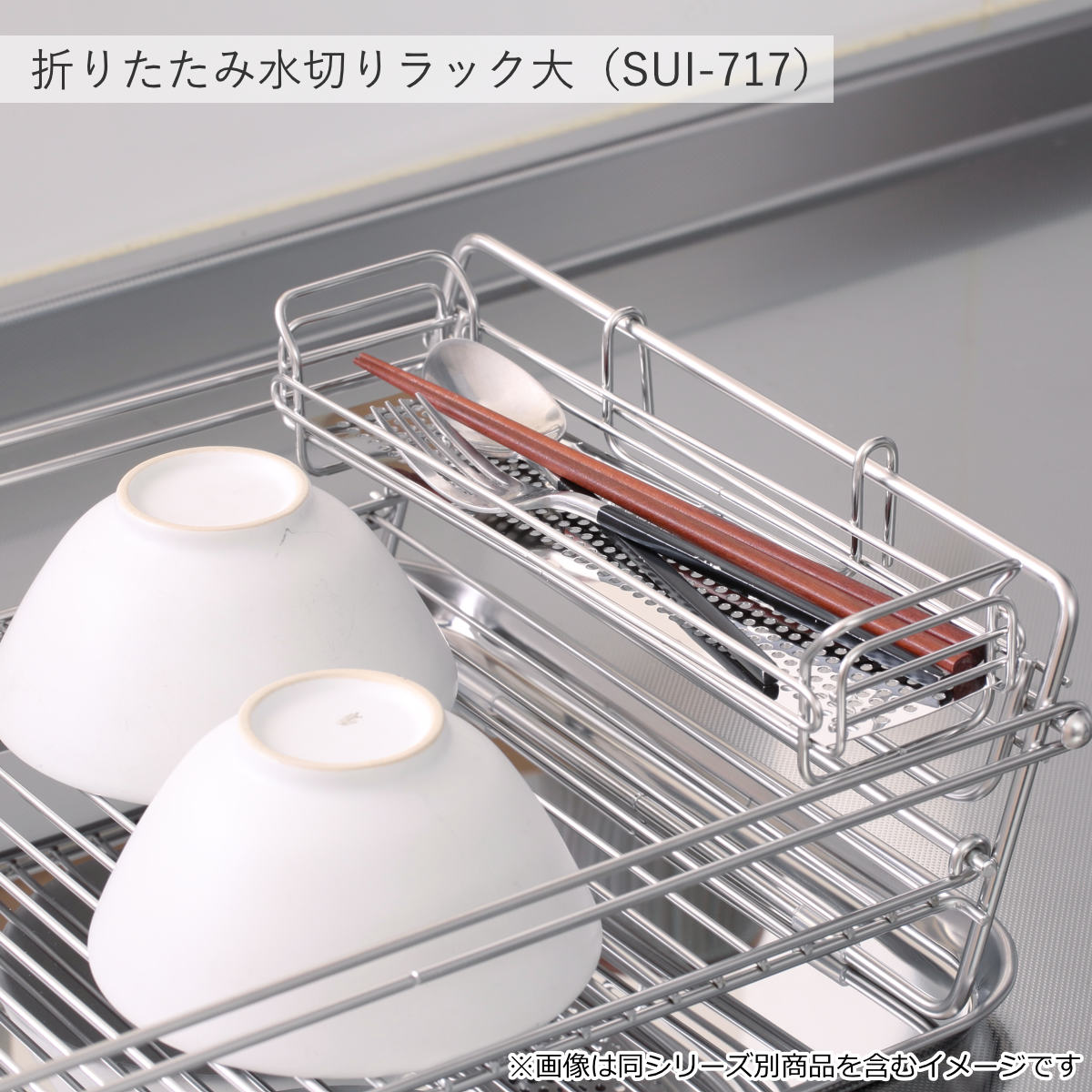 SUIマイスターシリーズの水切りかご(SUI-714~SUI-717)に掛けて使えるマルチポケットです。水切りかごに引っ掛けるだけで簡単に水切りスペースを増やすことができます。