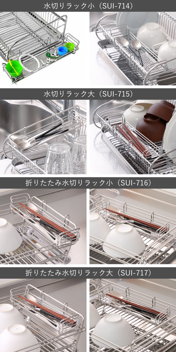 ![]() 水切りかご 小 (SUI-714) | ![]() 水切りかご 大 (SUI-715) | ![]() 折りたたみ式水切りかご 小 (SUI-716) |