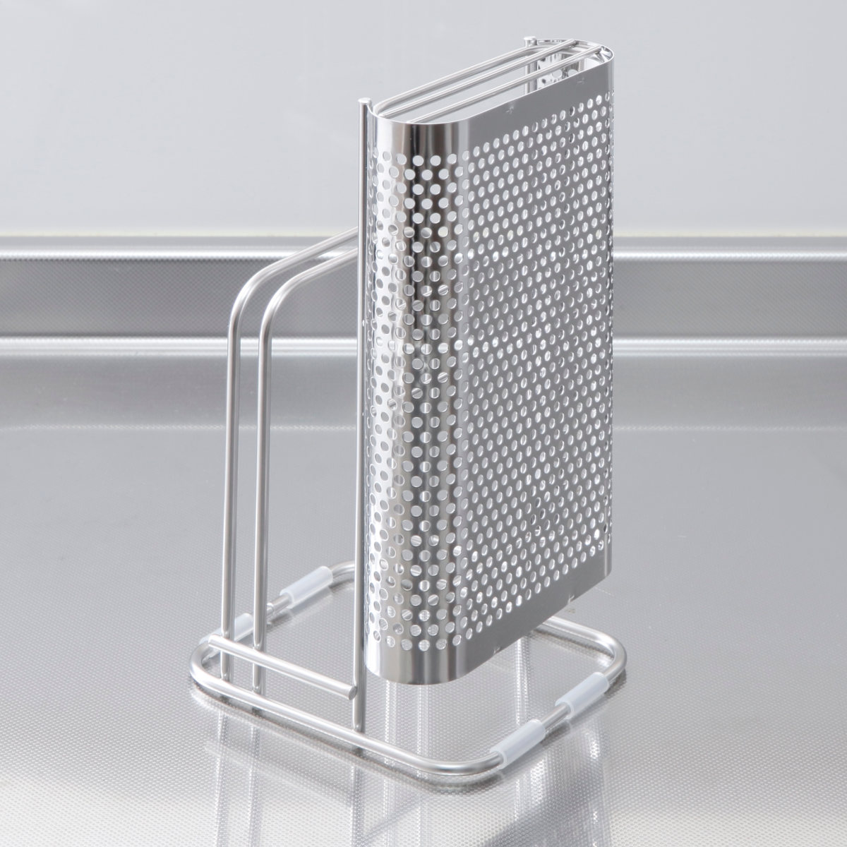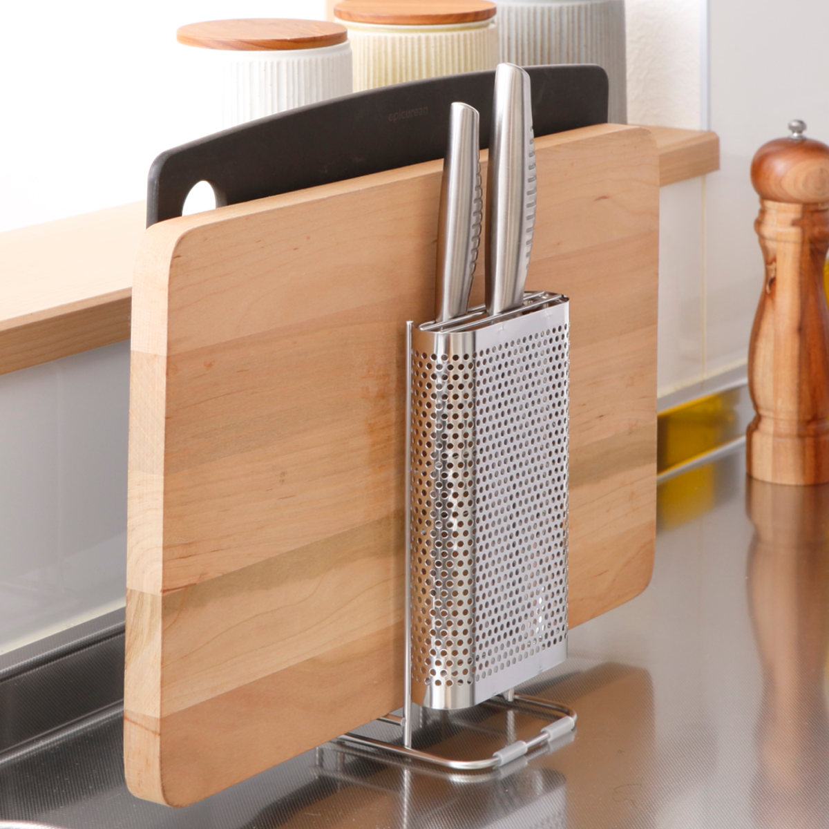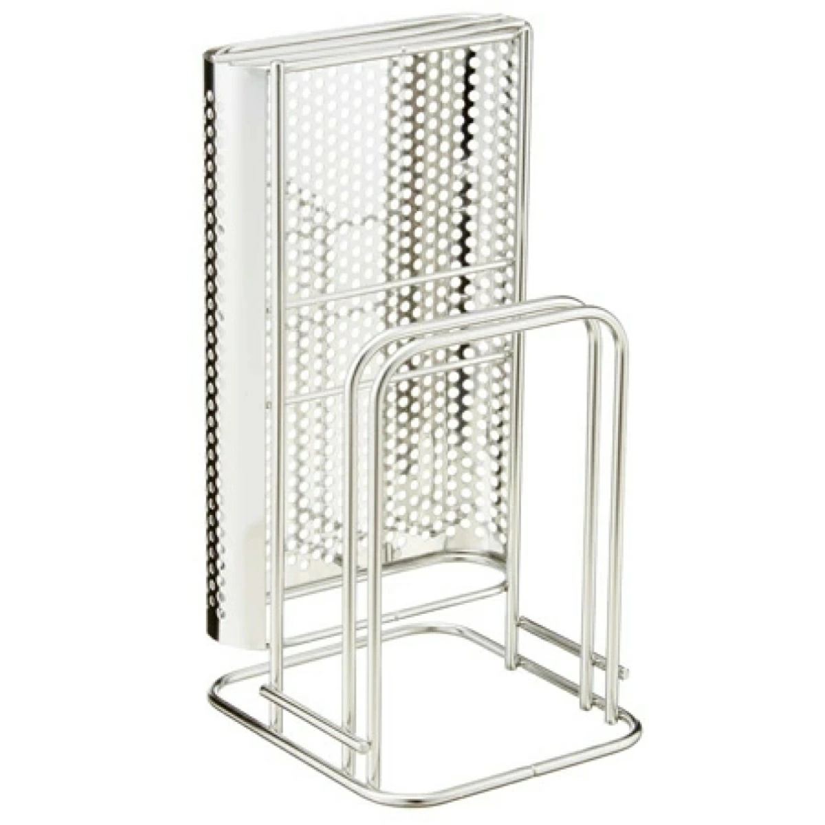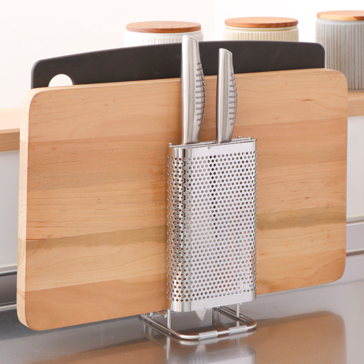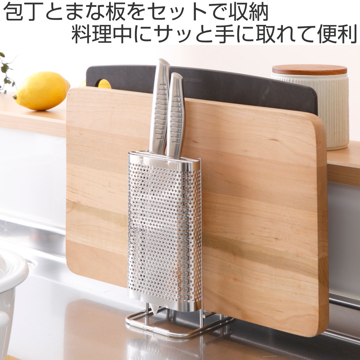 置き場に困る包丁とまな板をセットですっきり収納できるスタンドです。包丁2本、まな板2枚まで収納できます。通気性の良いパンチングとワイヤー構造なので洗ったばかりの包丁やまな板の乾燥にも便利です。