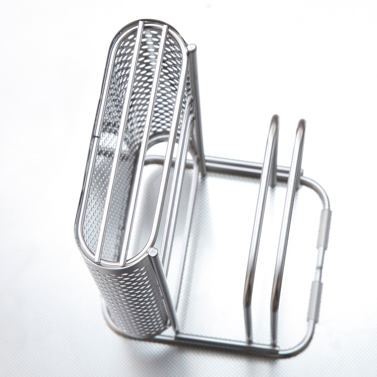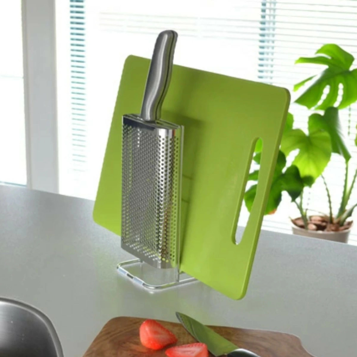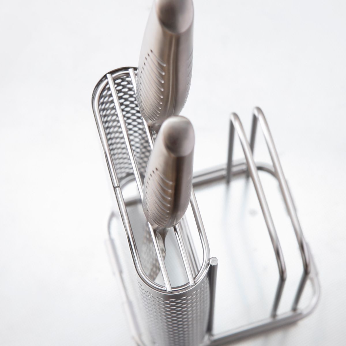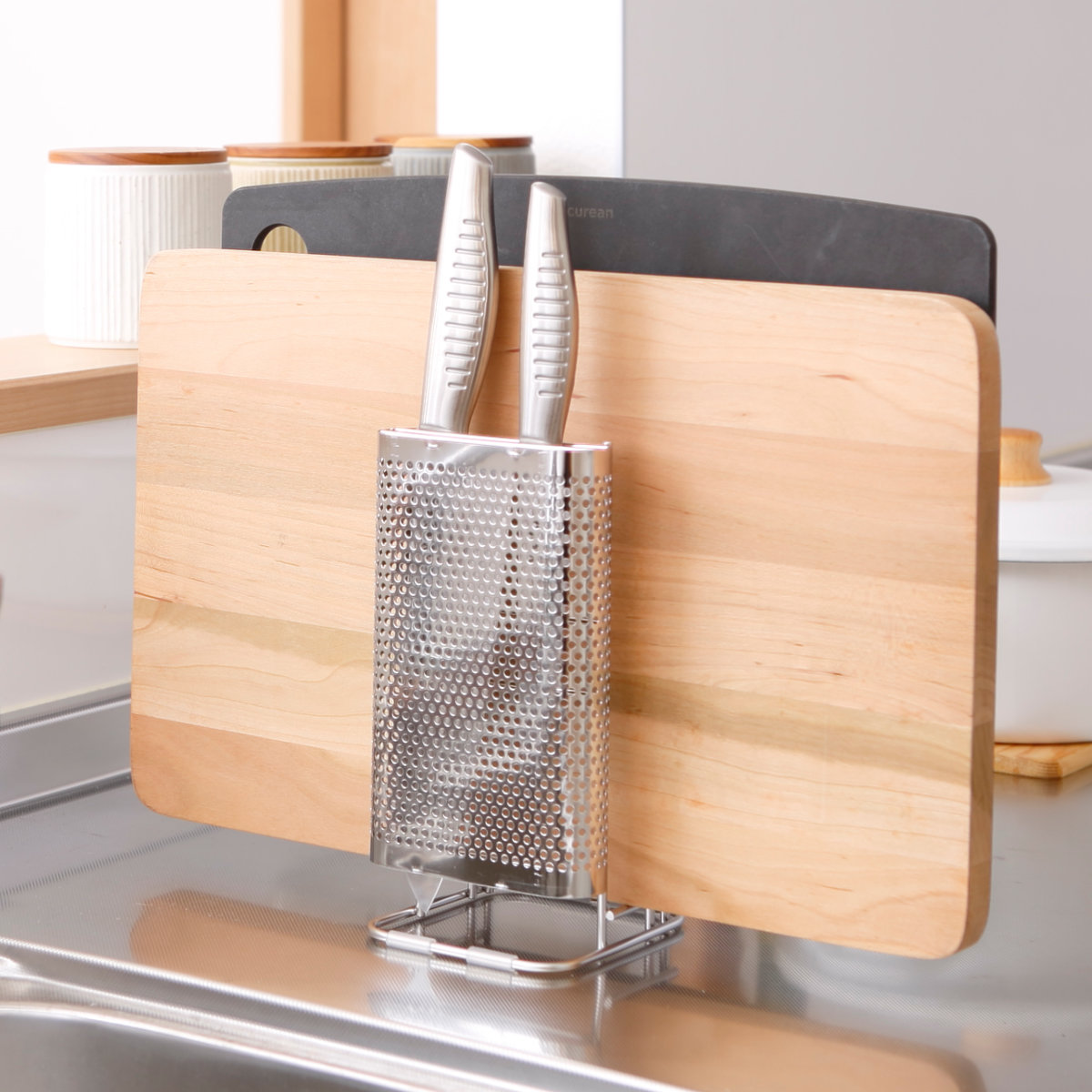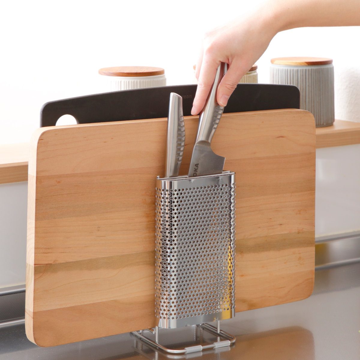 置き場に困る包丁とまな板をセットですっきり収納できるスタンドです。包丁2本、まな板2枚まで収納できます。通気性の良いパンチングとワイヤー構造なので洗ったばかりの包丁やまな板の乾燥にも便利です。