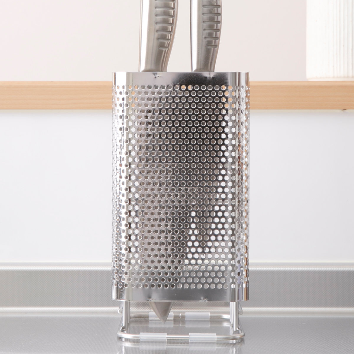 包丁の刃の部分をステンレスのパンチング板でカバーしています。包丁の刃を見せずに収納できるの安心感があります。