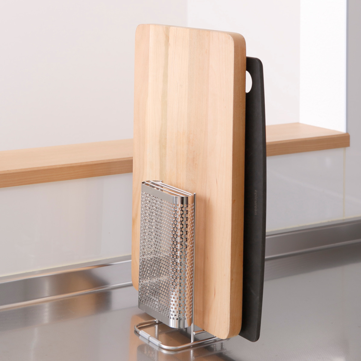 内側には厚さ3cmまでのまな板1枚、外側にはシートまな板が立てられます。厚めのまな板から薄いシートまな板などもしっかり立てて収納できるので便利です。
