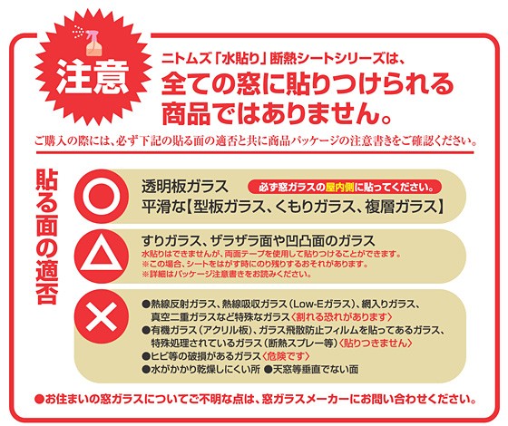 | 注意事項 | ■使用できるところ:透明板ガラス、型板ガラス、くもりガラス、複層ガラス ■使用できないところ:熱線反射ガラス、熱線吸収ガラス、網入りガラス、真空二重ガラス、有機ガラス(アクリル板)など |
