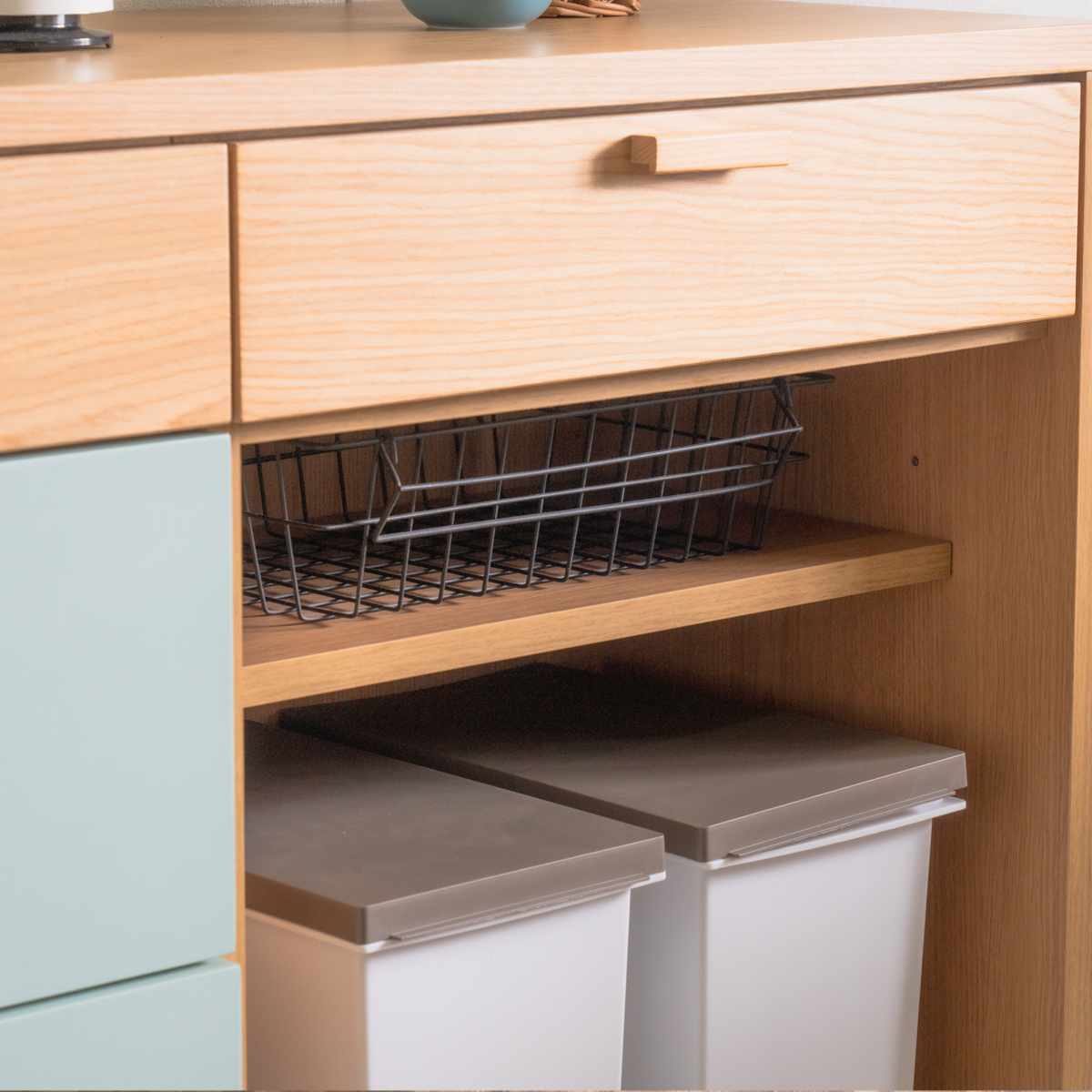 下部のオープンスペースは、ゴミ箱やスツールなどをまとめて置ける便利な収納スペースです。イスや収納ボックスなど、使い方は自由にアレンジできます。