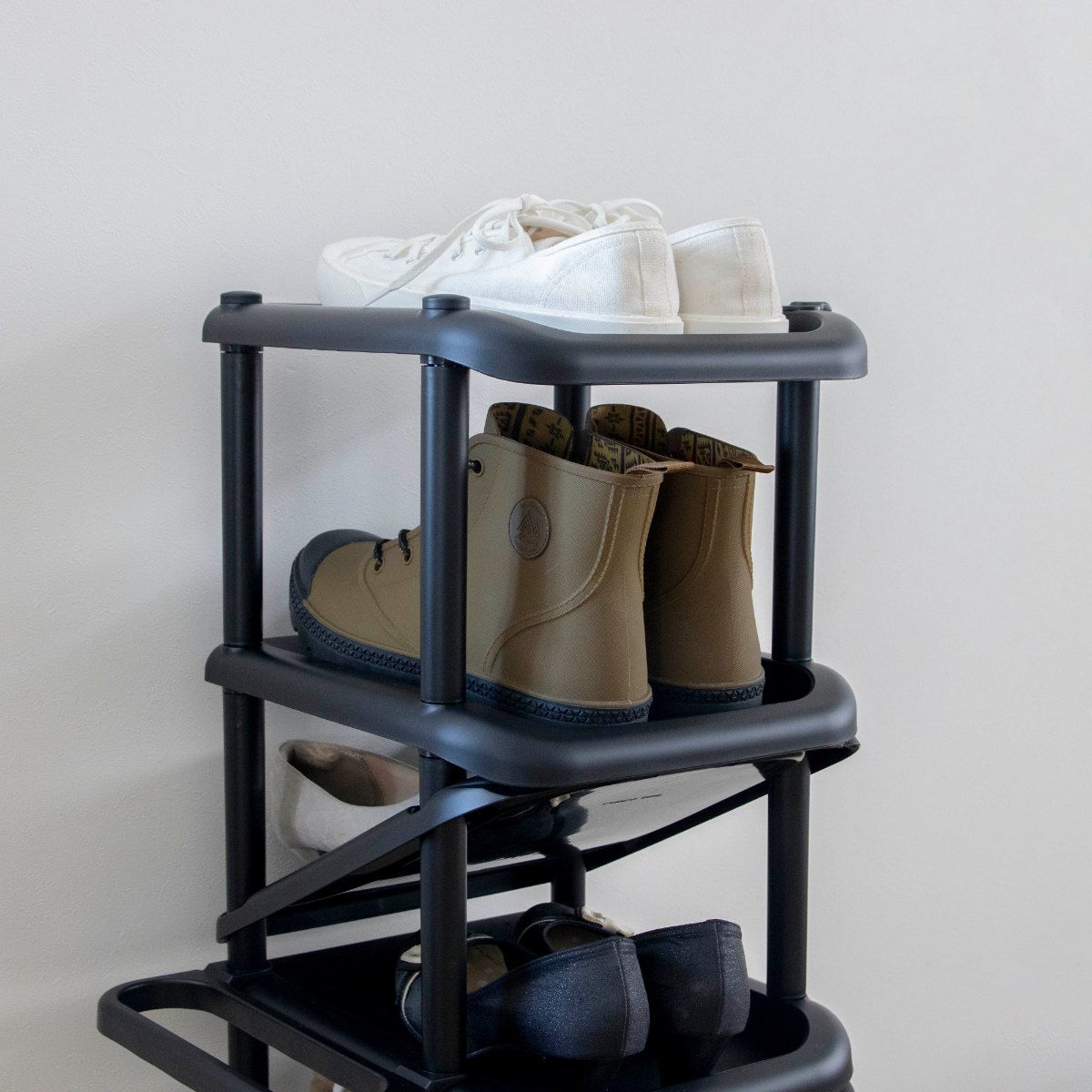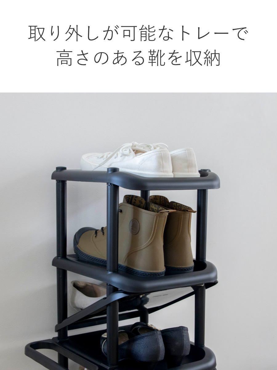 斜めに設置されたトレーは取り外しが可能なため、高さのあるブーツやスニーカーも無理なく収納できます。靴のサイズや形に合わせて調整でき、収納の幅が広がります。