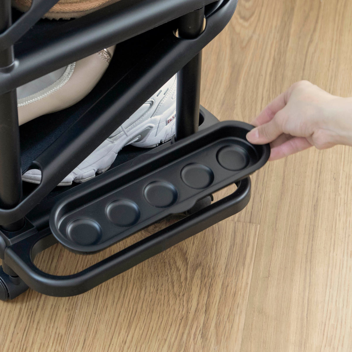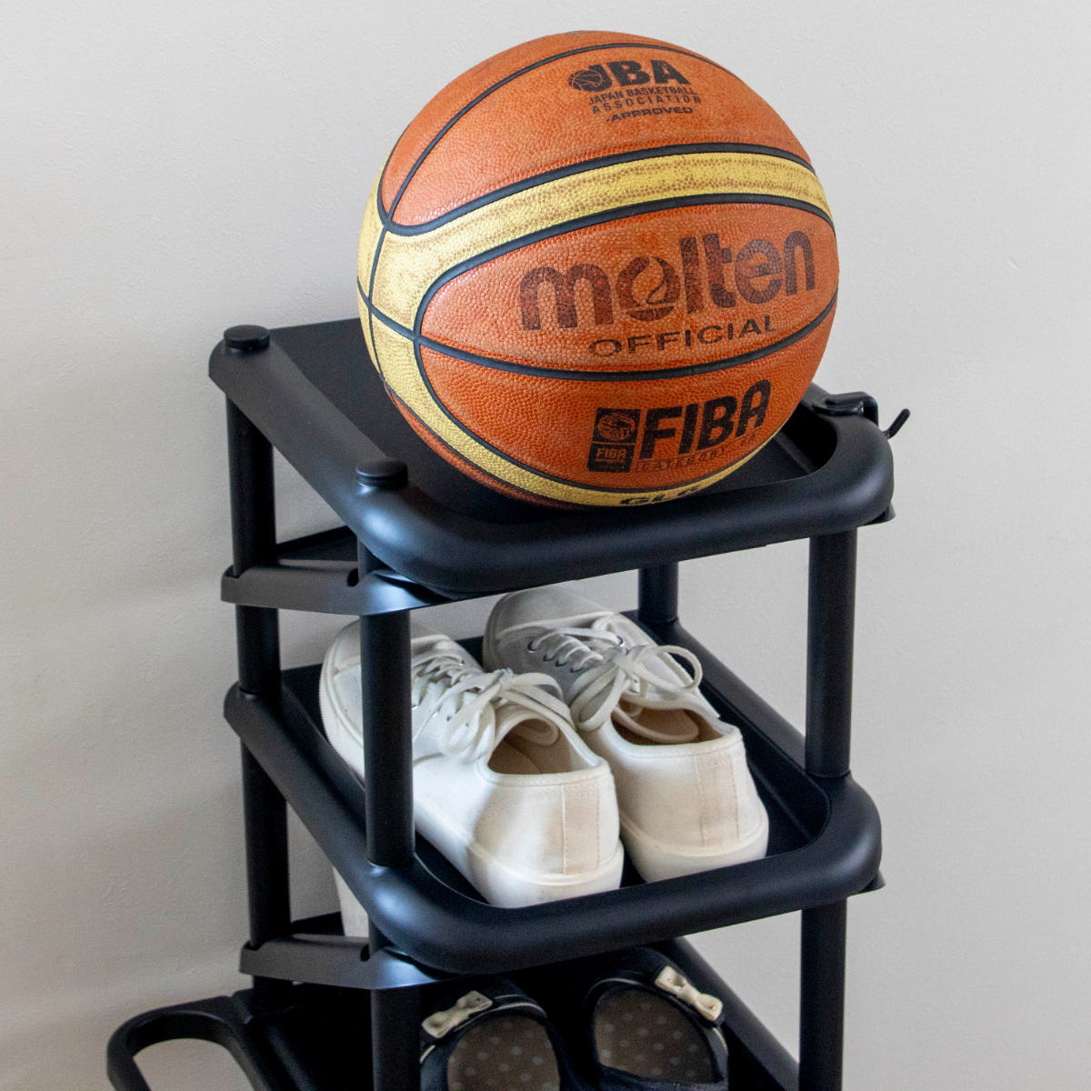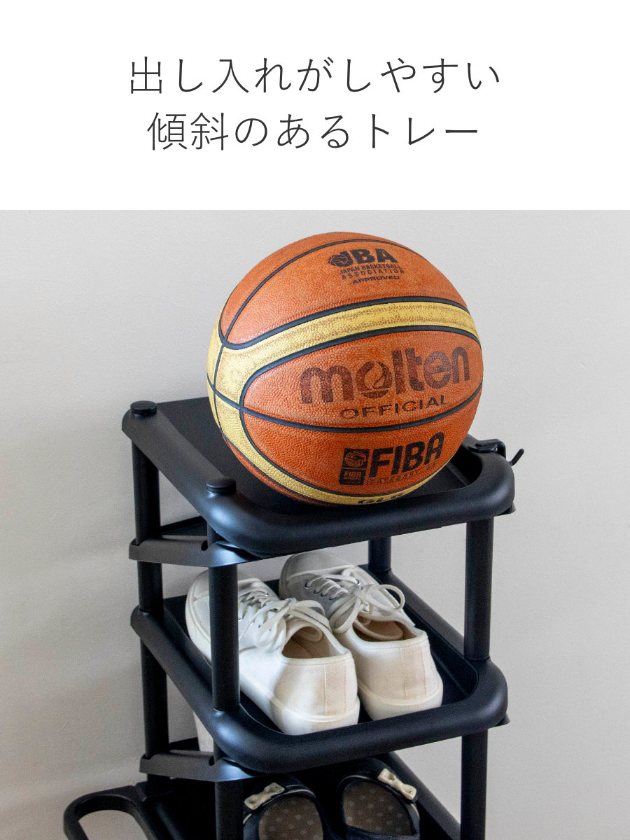 少し傾斜のあるトレーは、靴の出し入れがしやすい設計です。ストッパーの役割も果たすため、ボールやヘルメットなどの置き場所としても活躍します。