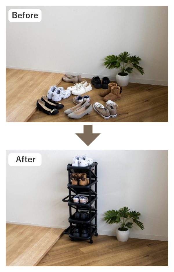 限られたスペースでも靴を効率よく収納できる、省スペース設計のシューズラックです。縦の空間を無駄なく活かすことで、靴をすっきり整理でき、玄関まわりを広く快適に整えられます。靴が散らかりがちな玄関も、見た目が整い、毎日の出入りがスムーズになります。