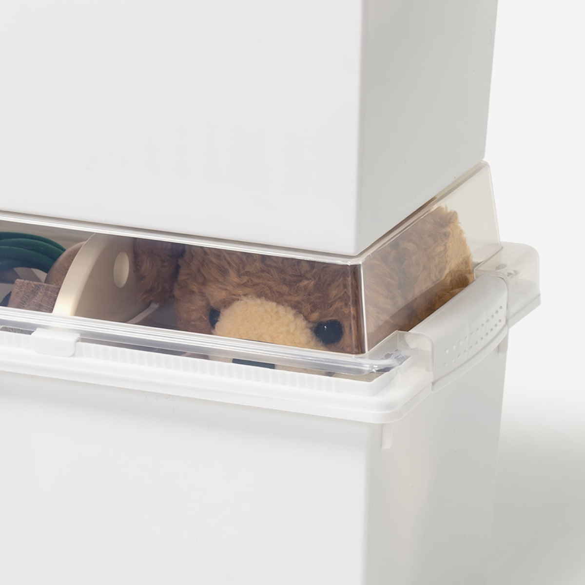 上部のフタが透明なので積み重ねても中身の確認ができ、棚などに並べていても見つけやすいです。フタには凹みを付けているので、重ねても滑り落ちにくく安心です。