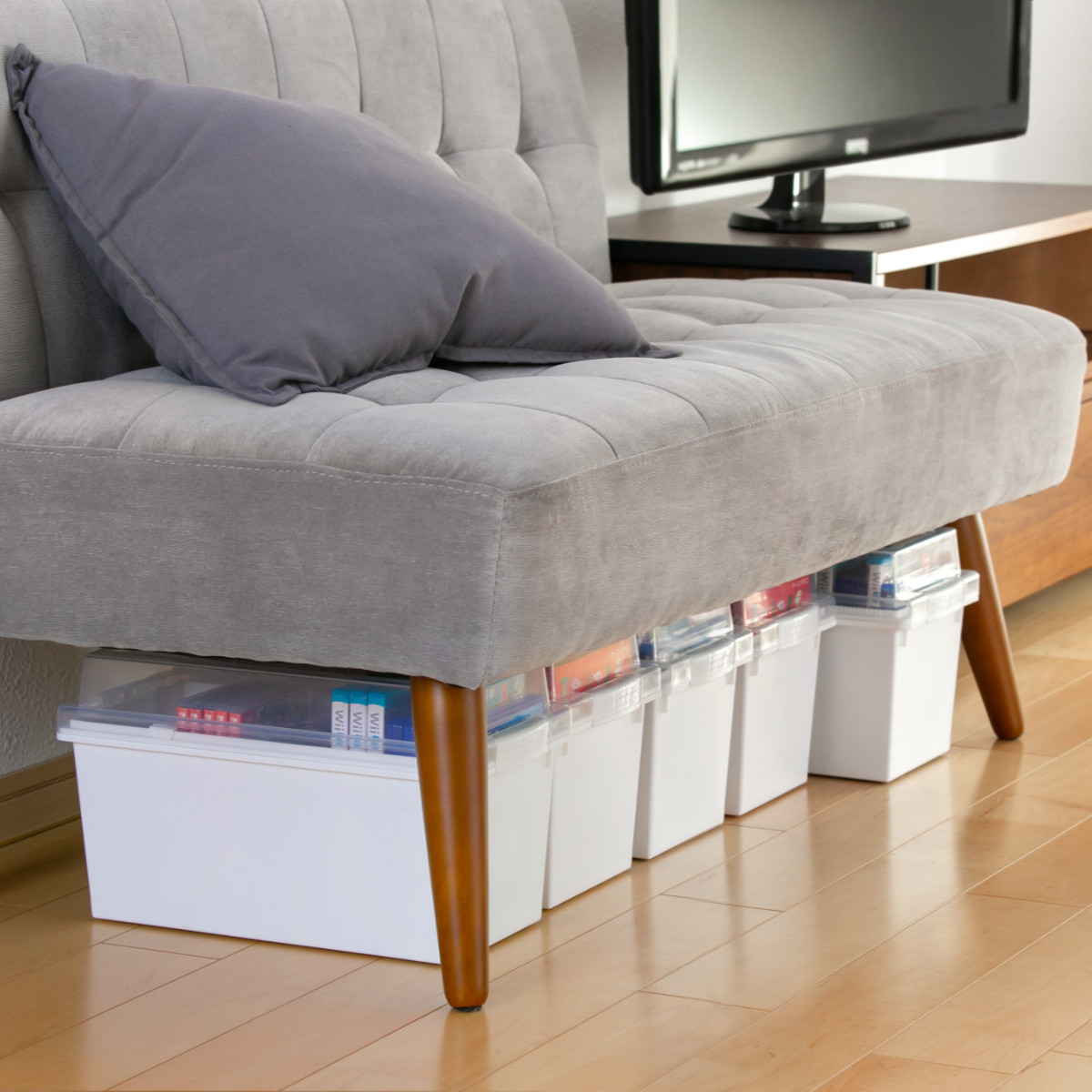 フタのロック部分に手を掛ければ出し入れもスムーズにできるので、ソファ下やベッド下スペースの活用にぴったりです。ベッド下は埃が被りやすいですが、フタ付きなので安心です。