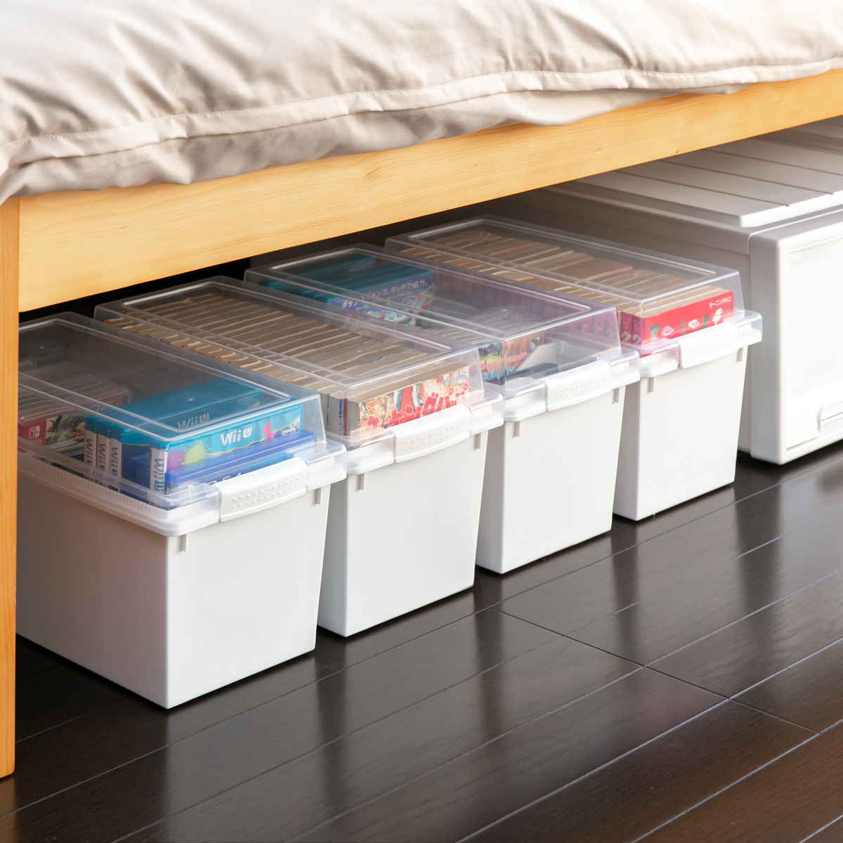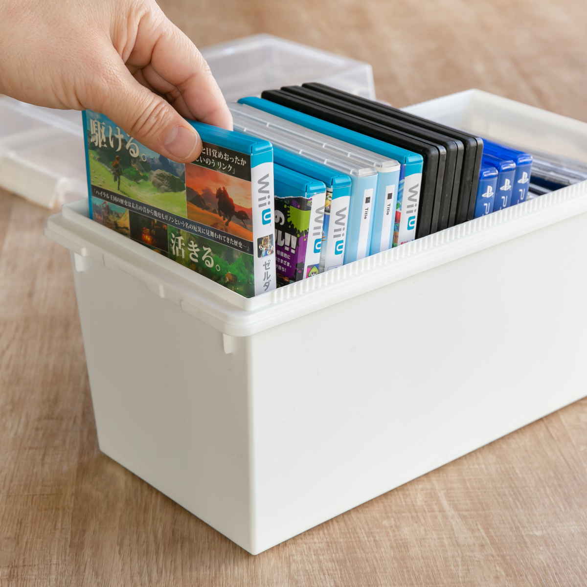 お気に入りのCDやDVD、ゲームソフトを大切に保管するのに役に立ちます。フタが付いているので埃が被らずキレイに保管でき、ゲーム機本体とゲームソフトを一緒に収納すれば、お子様のお片付けの習慣も身に付きやすくなります。