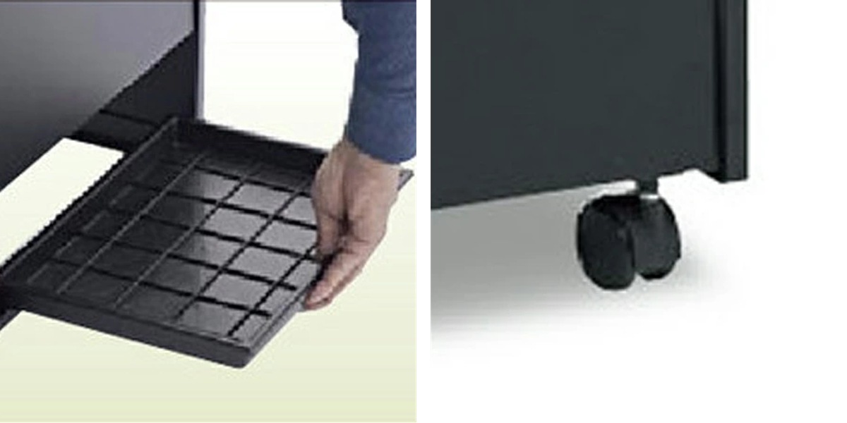 | 水受け皿付き 水の受け皿を深くして排水時の水こぼれを軽減しました。 | キャスター付き 移動・設置がラクな大型キャスター付きです。 |