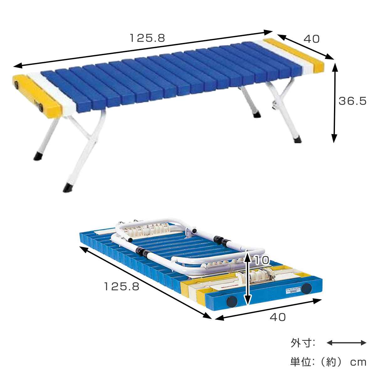 | サイズ | 約 幅125.8×奥行40×高さ36.5(cm) 収納時:約 幅125.8×奥行40×高さ10(cm) |