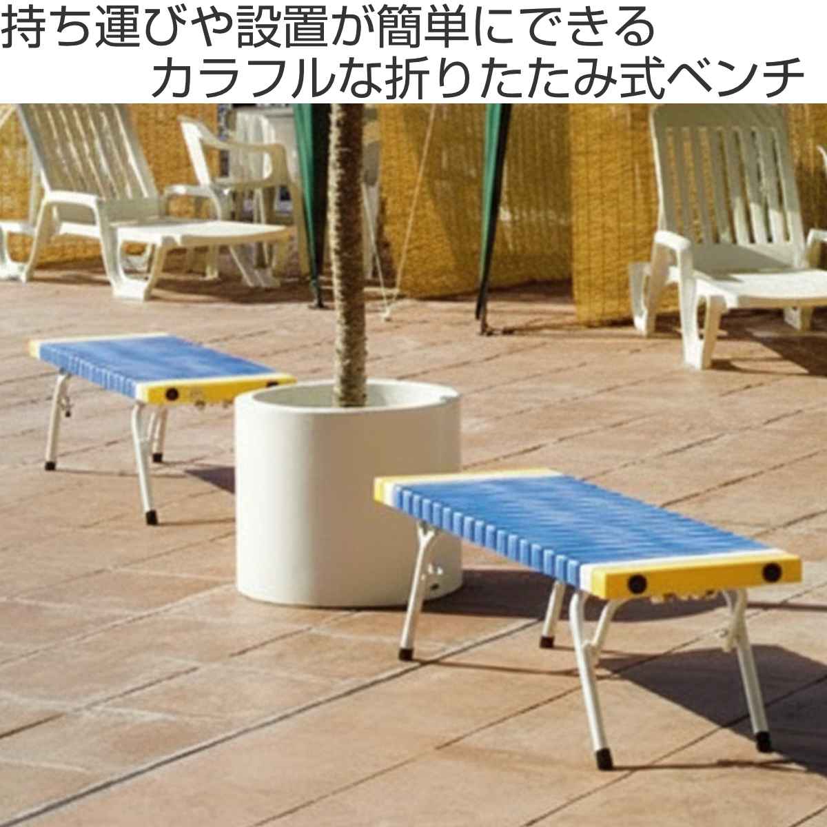 カラフルな配色が空間に映える屋外用ベンチです。折りたたみ式なので持ち運びや設置が簡単で、使用しない時はコンパクトに収納できます。複数人でのアウトドアはもちろん、臨時イベントや商業施設などの幅広いシーンでお使いいただけます。