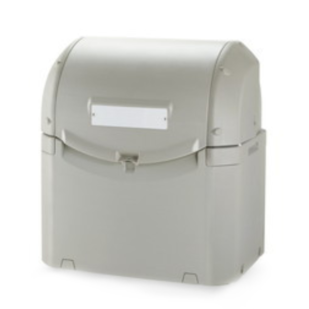 軽量スライド蓋でゴミ捨てがもっと楽になる集積保管容器です。ゴミの入った45Lポリ袋が約11個入ります。本体底部には固定穴、南京錠がかけられるカギ穴付きです。