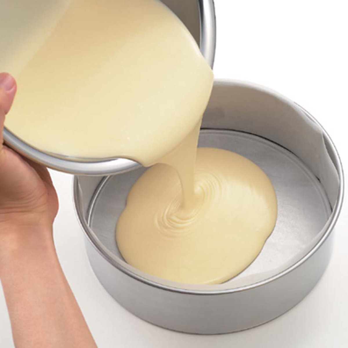 底板が外れるタイプのスポンジケーキ型です。仕上がりが柔らかく、ひっくり返して取り出すことのできないお菓子作りに適しています。焦げ付きにくく、きれいな焼き上がりのままお皿にうつすことができます。