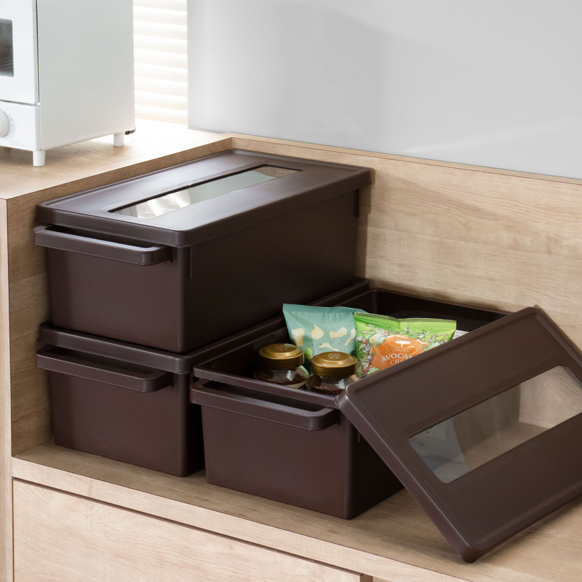 フタ付の収納ケースは、キッチンで食料品や調味料を入れたり、洗面所でスキンケアや歯ブラシのストックを入れたりと、日用品を整理するのにも便利です。また、サイズ違いの「CDケース」と組み合わせると収納の幅がさらに広がり、さまざまなシーンで活用できます。
