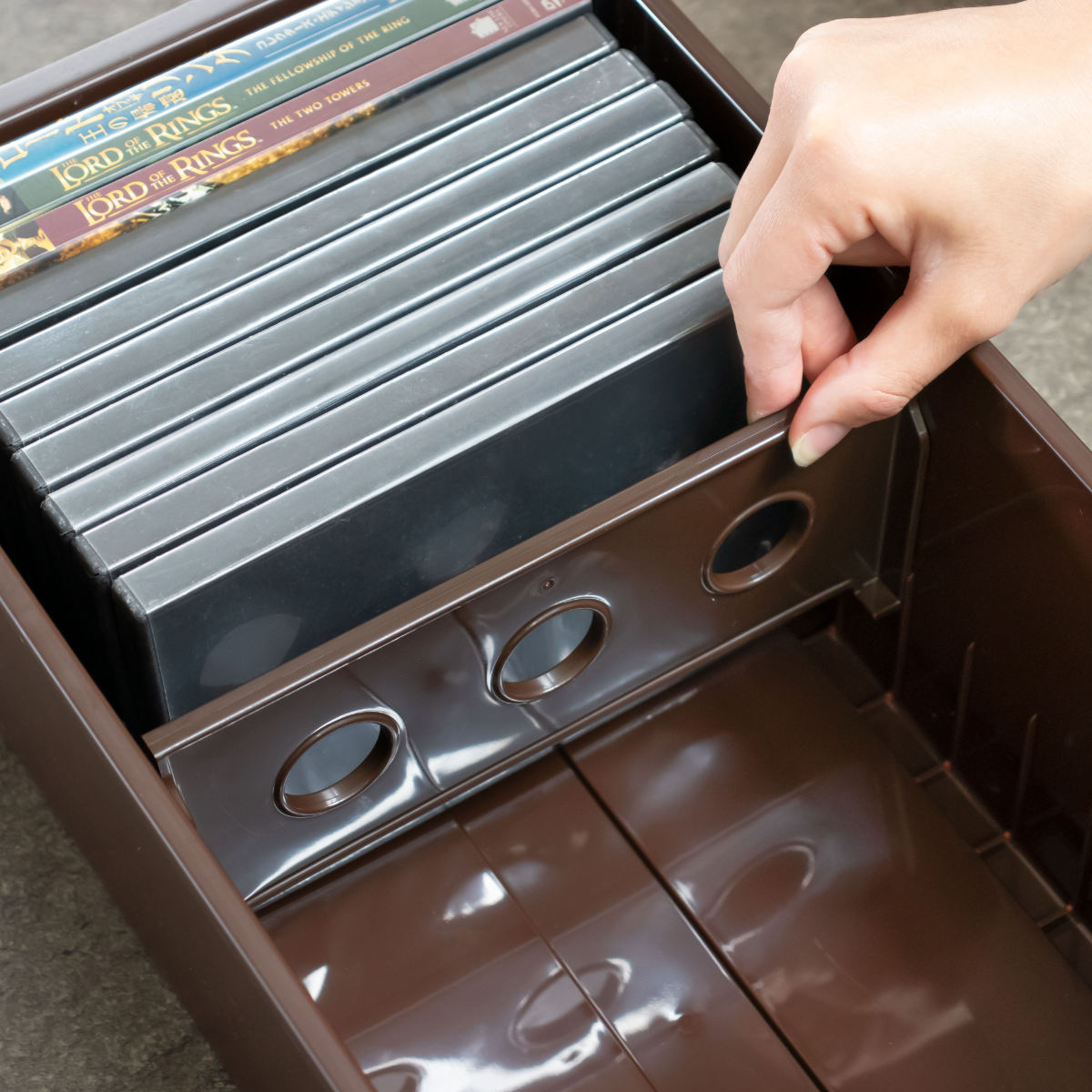 空間に余白がある状態でもDVDが倒れるのを防ぐ、仕切り板が1枚付いています。収納枚数に合わせて自由に位置を変更でき、振動や衝撃によるズレを防ぎます。