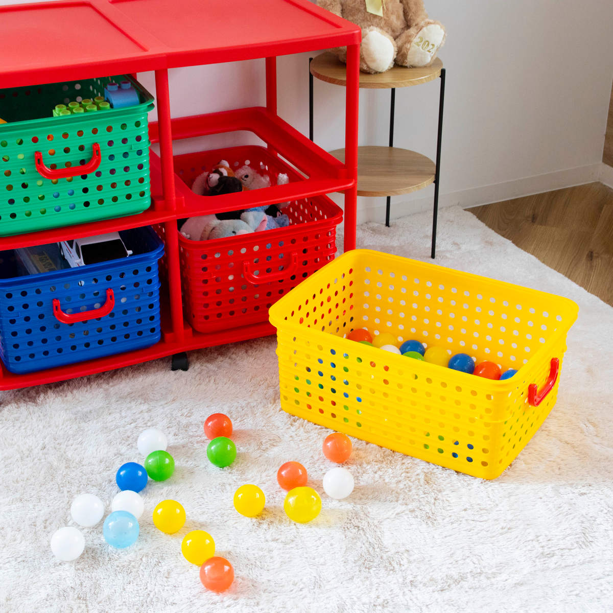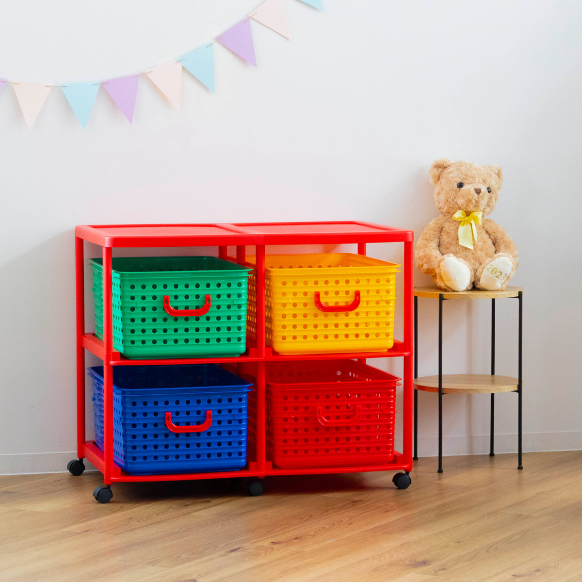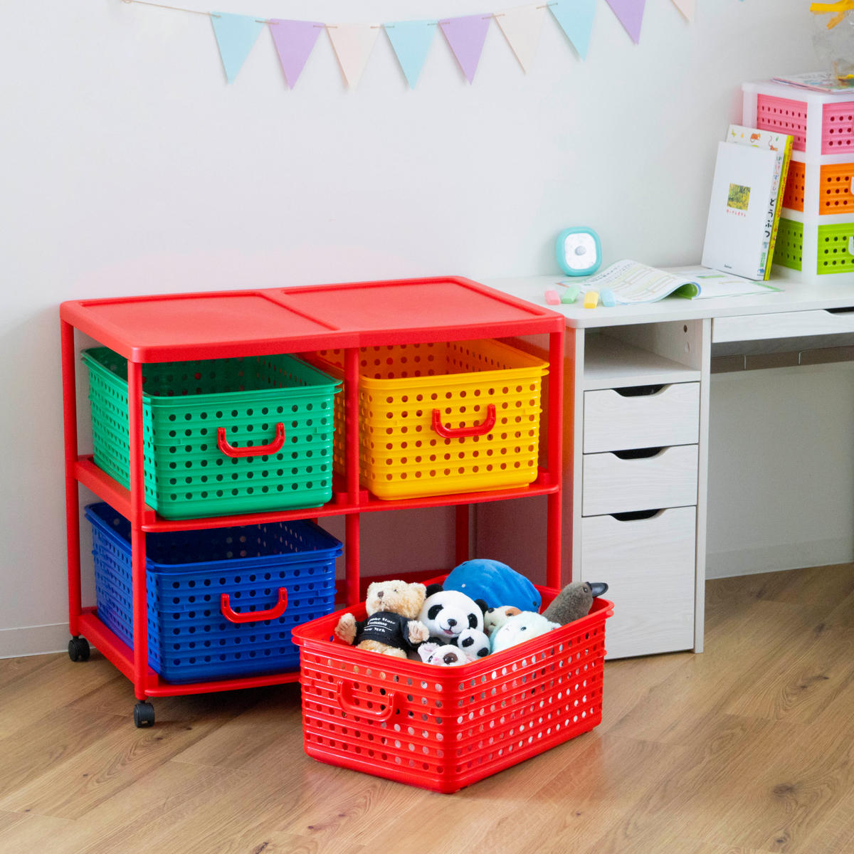 4つのカラフルなバスケットが入った2段のバスケットラックは、お子様のお片付け習慣をサポートします。色で分けて収納するものを決められるので、小さなお子様でも覚えやすく、ゲーム感覚で楽しくお片付けの習慣が身に付きます。フタのないシンプルな形状のバスケットで、お子様が自分でおもちゃを片付けやすくなっています。