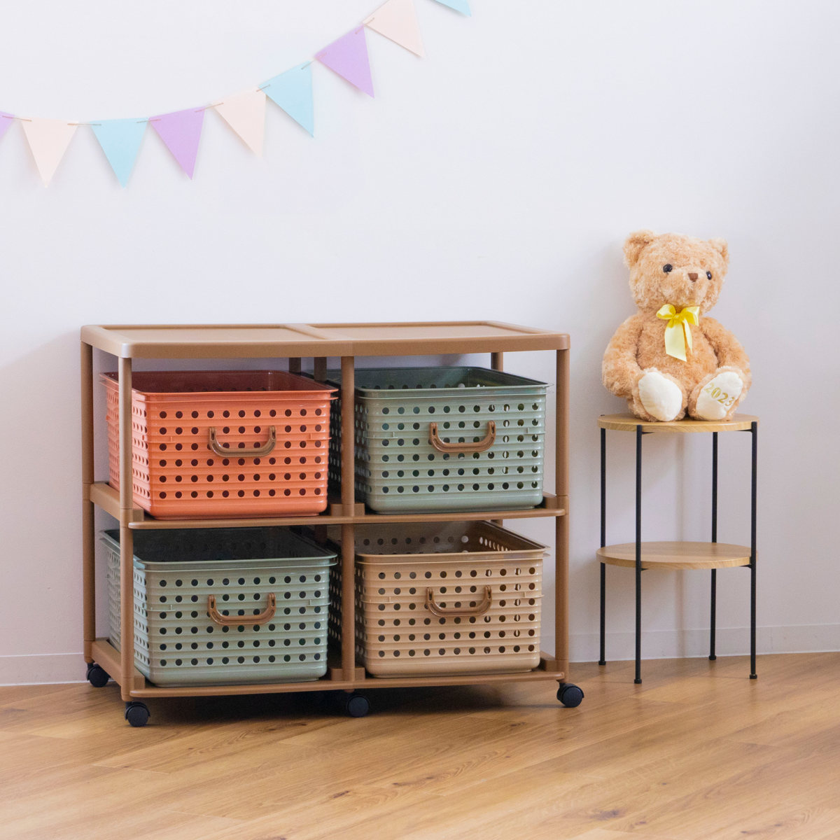 バスケットラックは、ビビットでポップな色合いが子供部屋にもピッタリな「カラフル」と、くすみカラーで落ち着いた「ニュアンス」の2カラー展開しています。お部屋の雰囲気や、お好みに合わせてお好きなカラーをお選びいただけます。