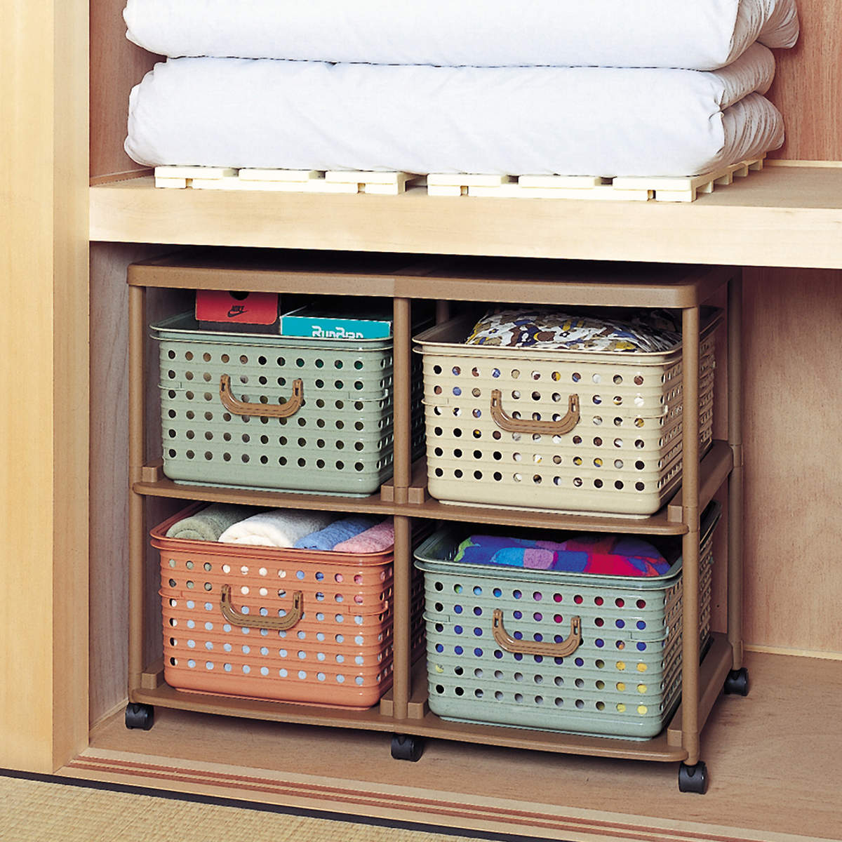 ニュアンスカラーは、落ち着いた色合いなのでリビング収納やクローゼット収納にも使いやすくなっています。ラックは高さが低いのでそのまま押入れ収納としても使えます。