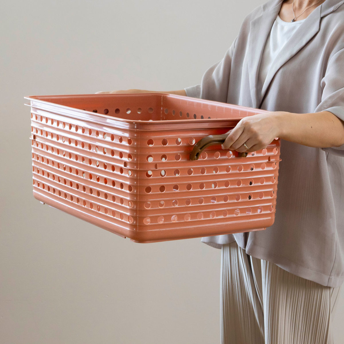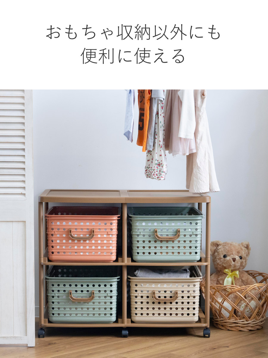 また、畳んだ家族の洗濯物をバスケットの色別に振り分け、各自で片付けてもらう用のケースとして使うなど、アイディア次第で収納以外にも幅広い用途でお使いいただけます。